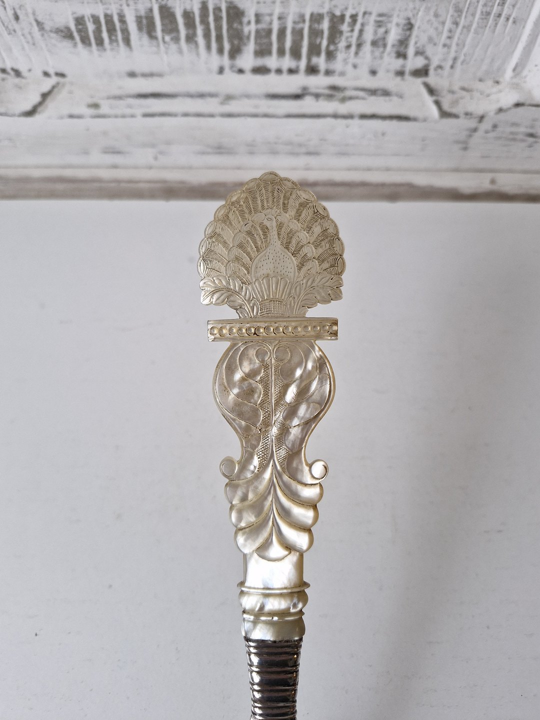 Stor fiskespade i sølv med perlemors håndtag. Sølv laf med gennembrudt kant, smukt dekoreret med en engel og blomster. Perlemors håndtaget er smukt udskåret med en påugl.