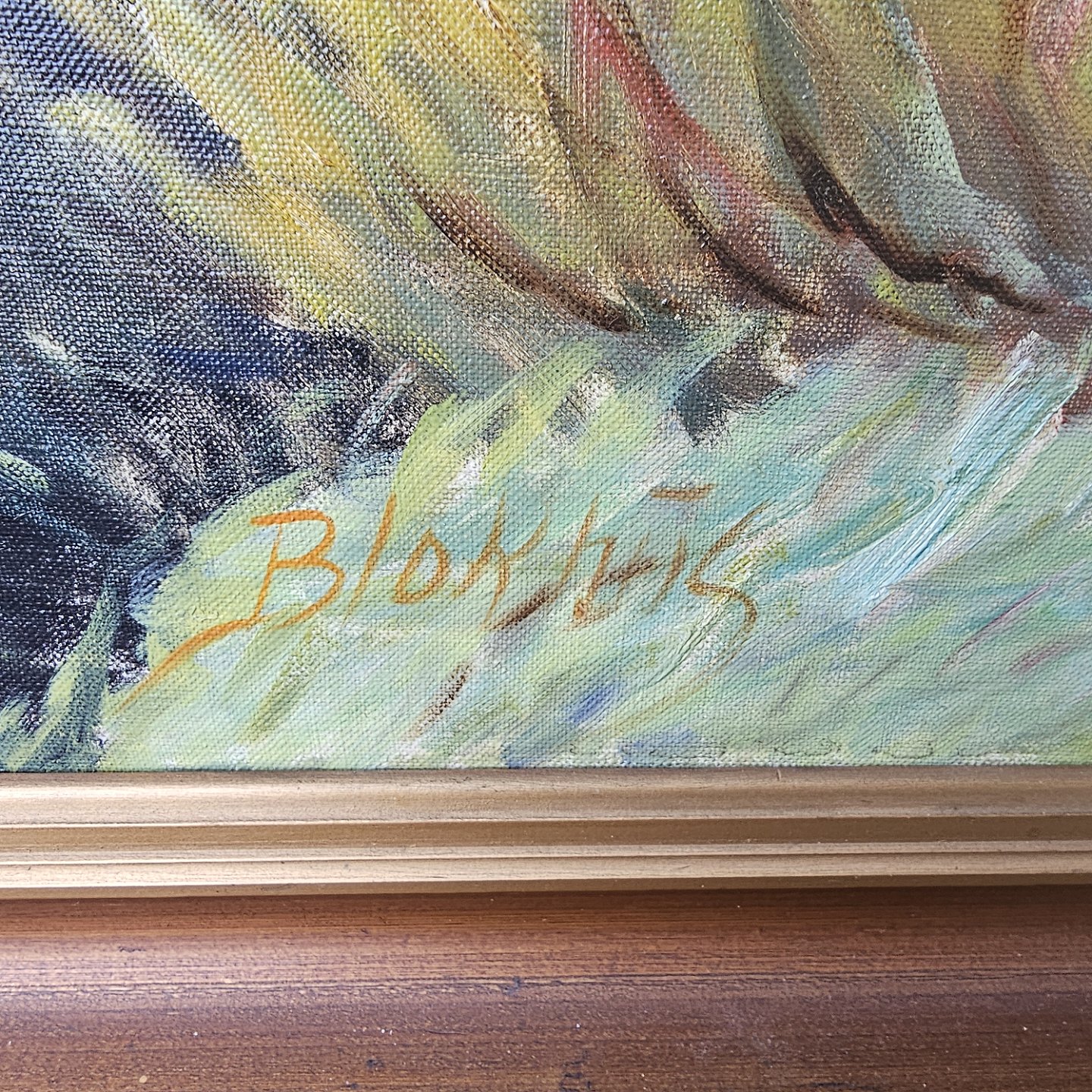 Oliemaleri på lærred med titlen Blokhus. Monteret i guldramme med motiv af landevejen til Blokhus