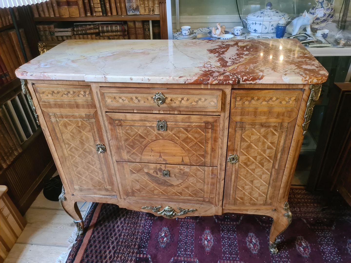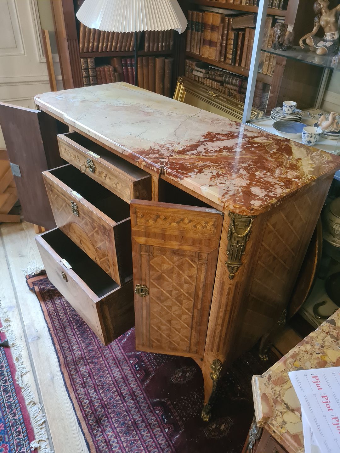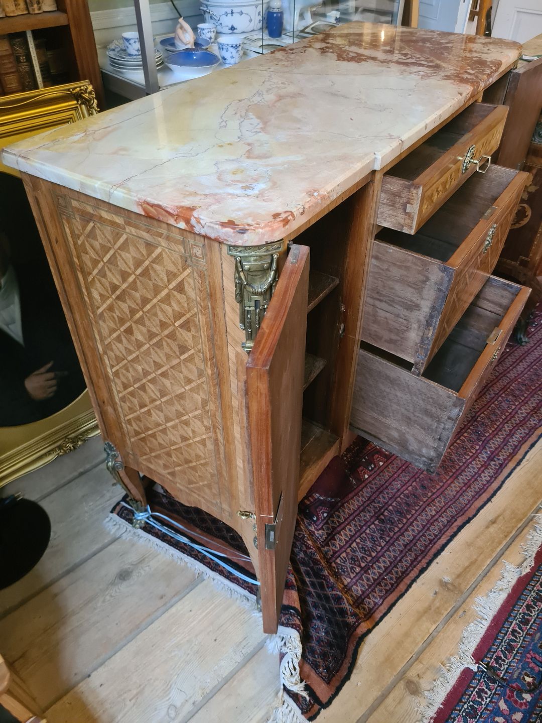Kommode fra sidst i 1800 tallet. Fremstillet i rokokostil med låger og løstliggende marmorplade på toppen. Fremstår pæn og velholdt uden de store brugsspor.