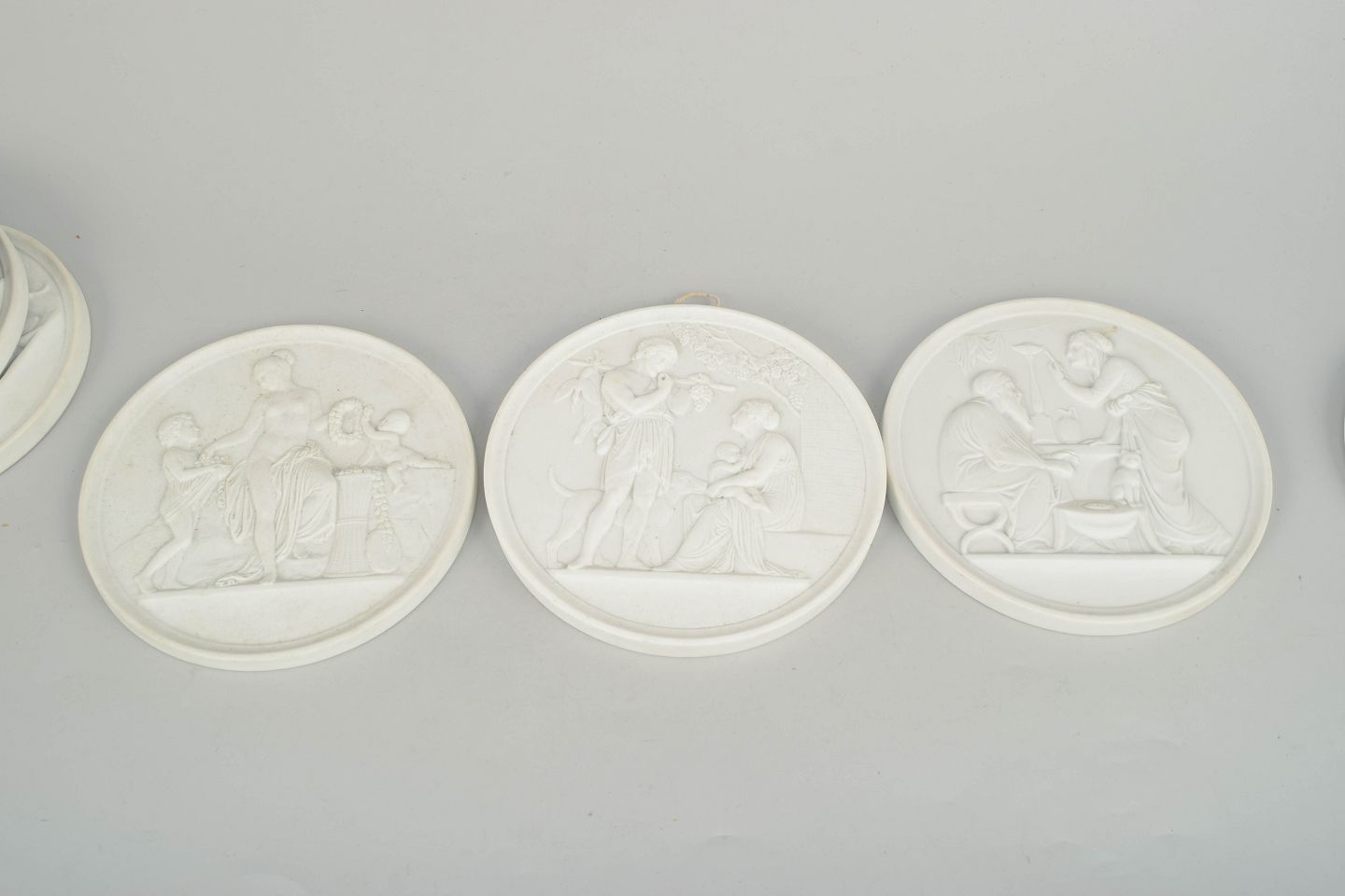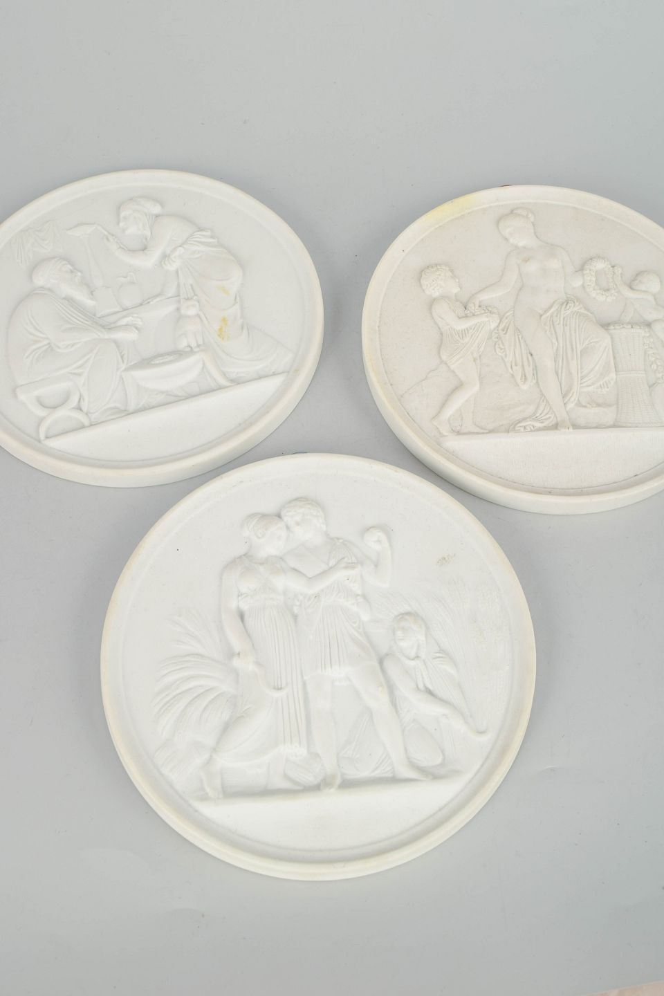 Relieffer i hvidt uglaseret porcelæn med klassiske motiver efter Bertel Thorvaldsen, udført i fin biscuit med detaljeret figurdekoration og ophæng på bagsiden. Første sortering.