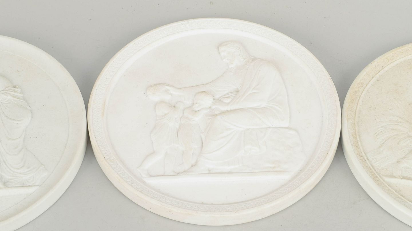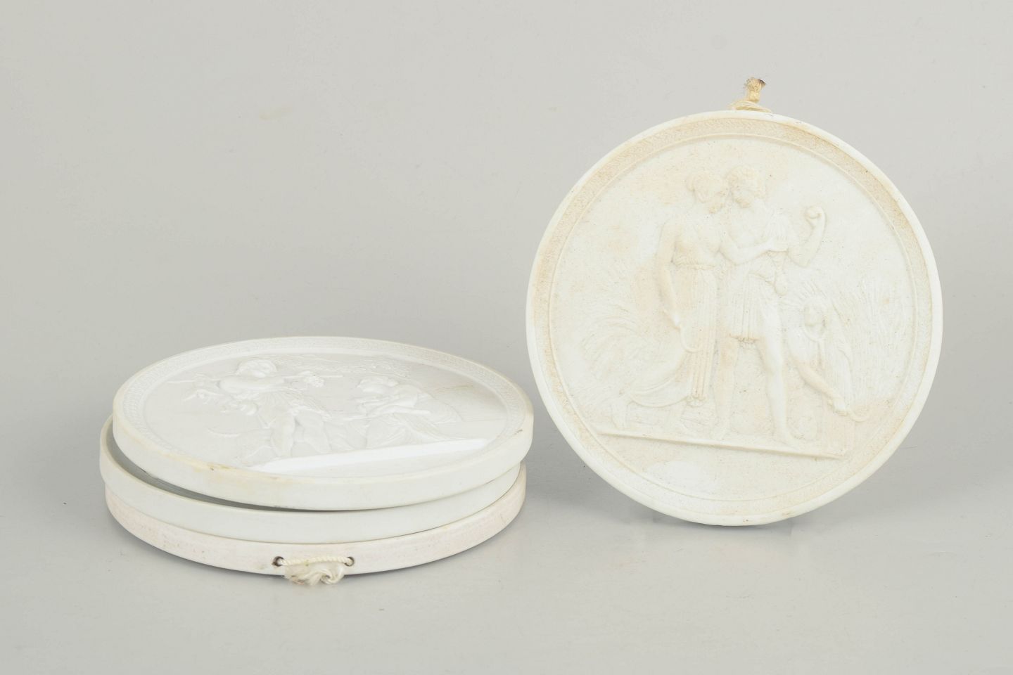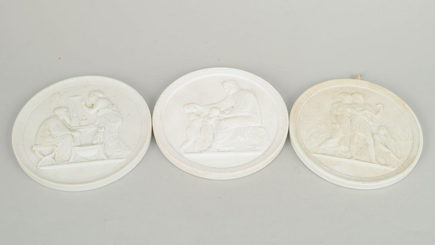 Relieffer i hvidt uglaseret porcelæn med klassiske motiver efter Bertel Thorvaldsen, udført i fin biscuit med detaljeret figurdekoration og ophæng på bagsiden. Første og tredje sortering.