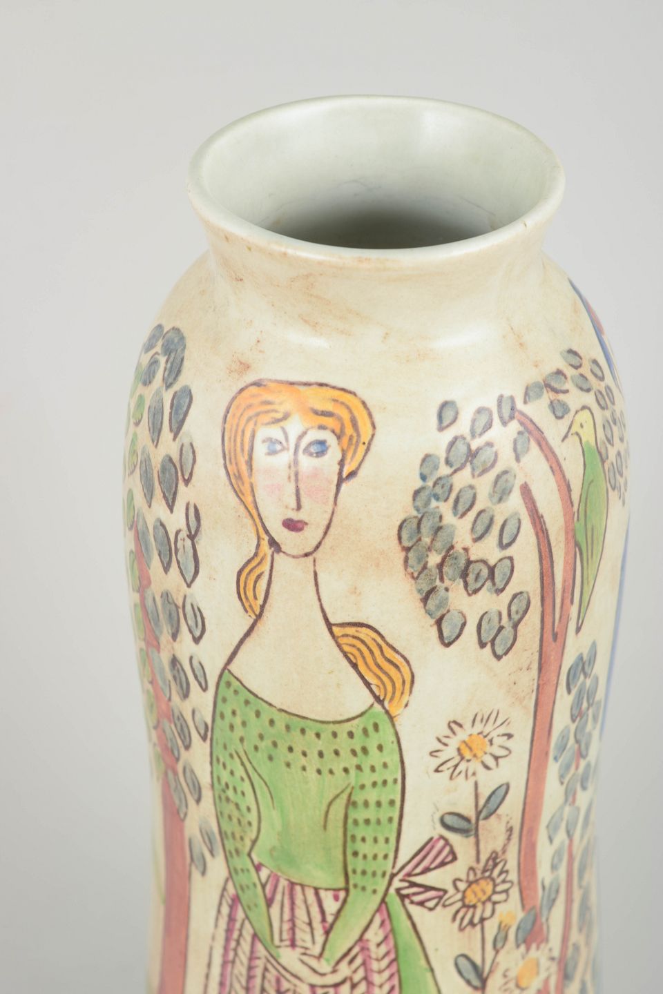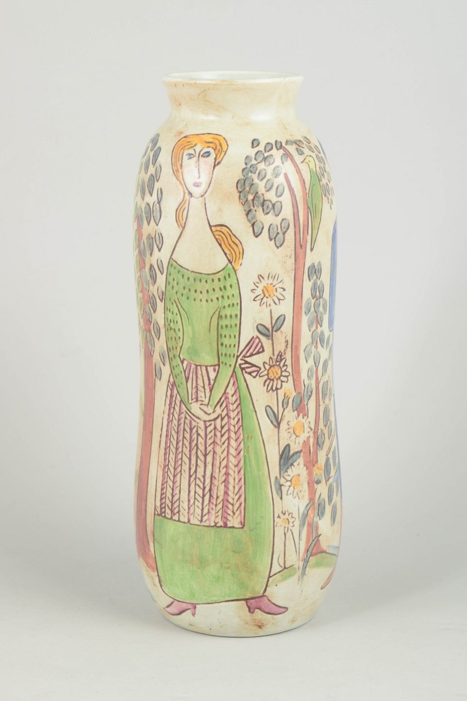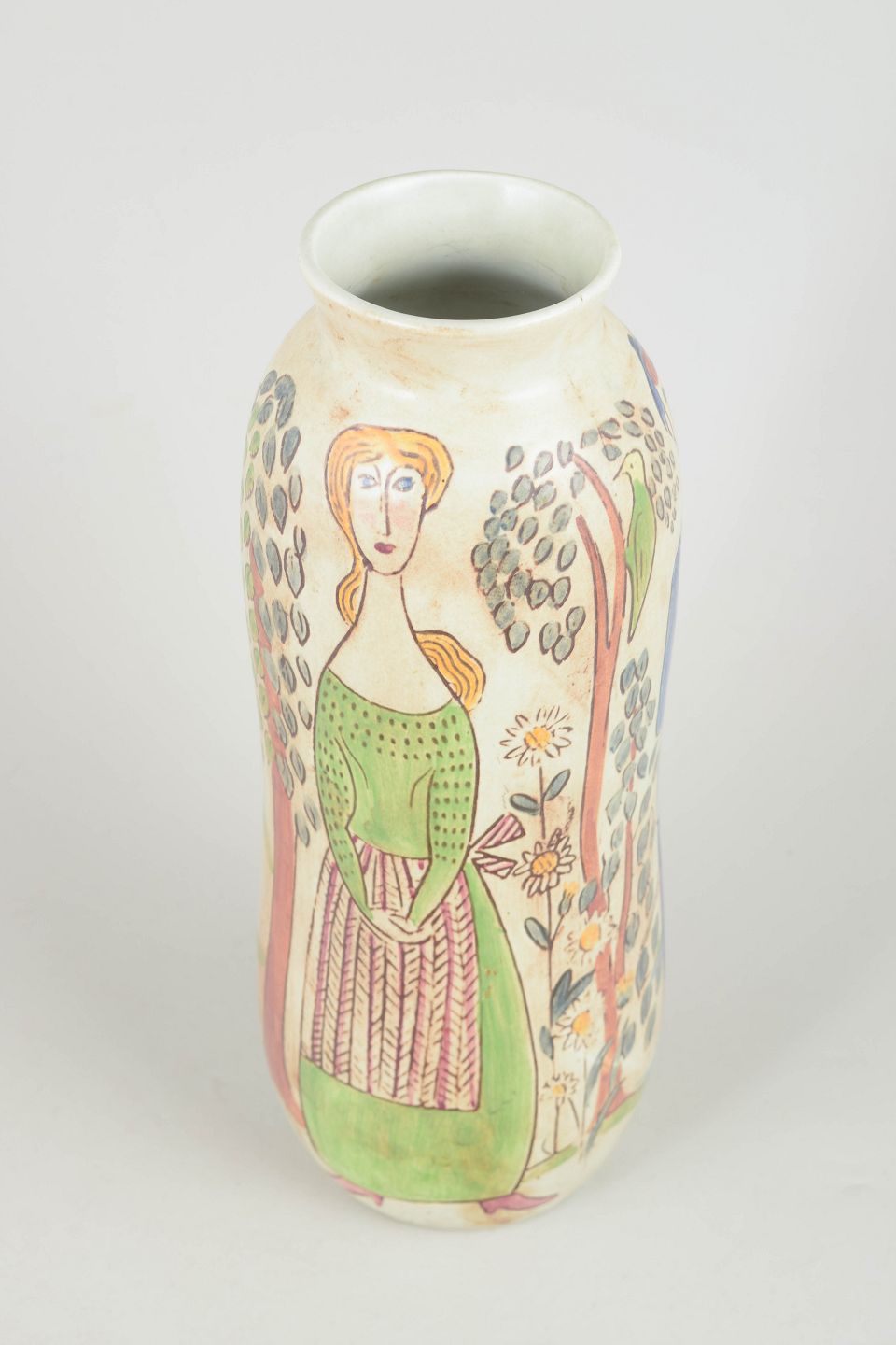 Slank stentøjsvase med håndmalet figurativ dekoration i grønne, røde og jordfarvede nuancer, udført i en karakteristisk kunstnerisk stil med tydelig reference til midten af det 20. århundredes skandinaviske keramik.