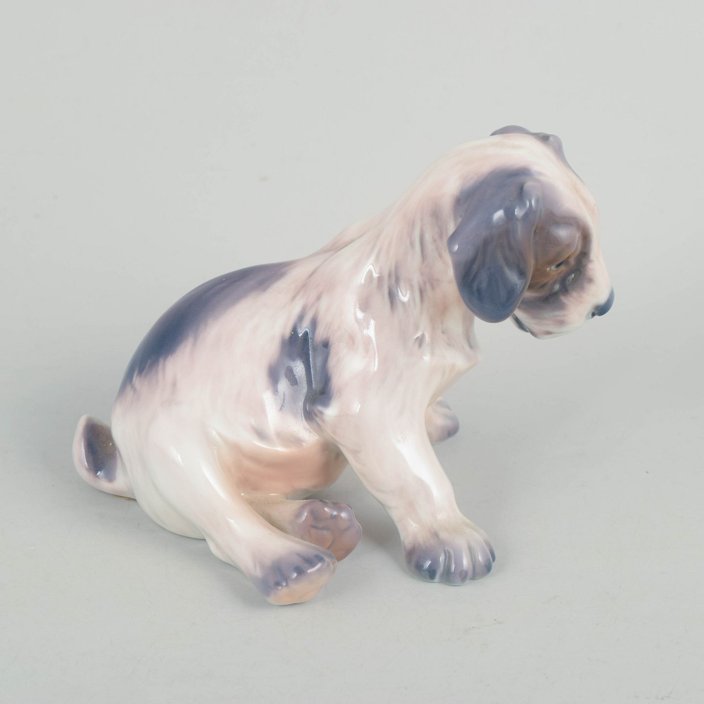 Naturalistisk udført porcelænsfigur af siddende hund med bløde former og fint modellerede detaljer. Glaseret i afdæmpede nuancer med brungrå markeringer. Model 1008.