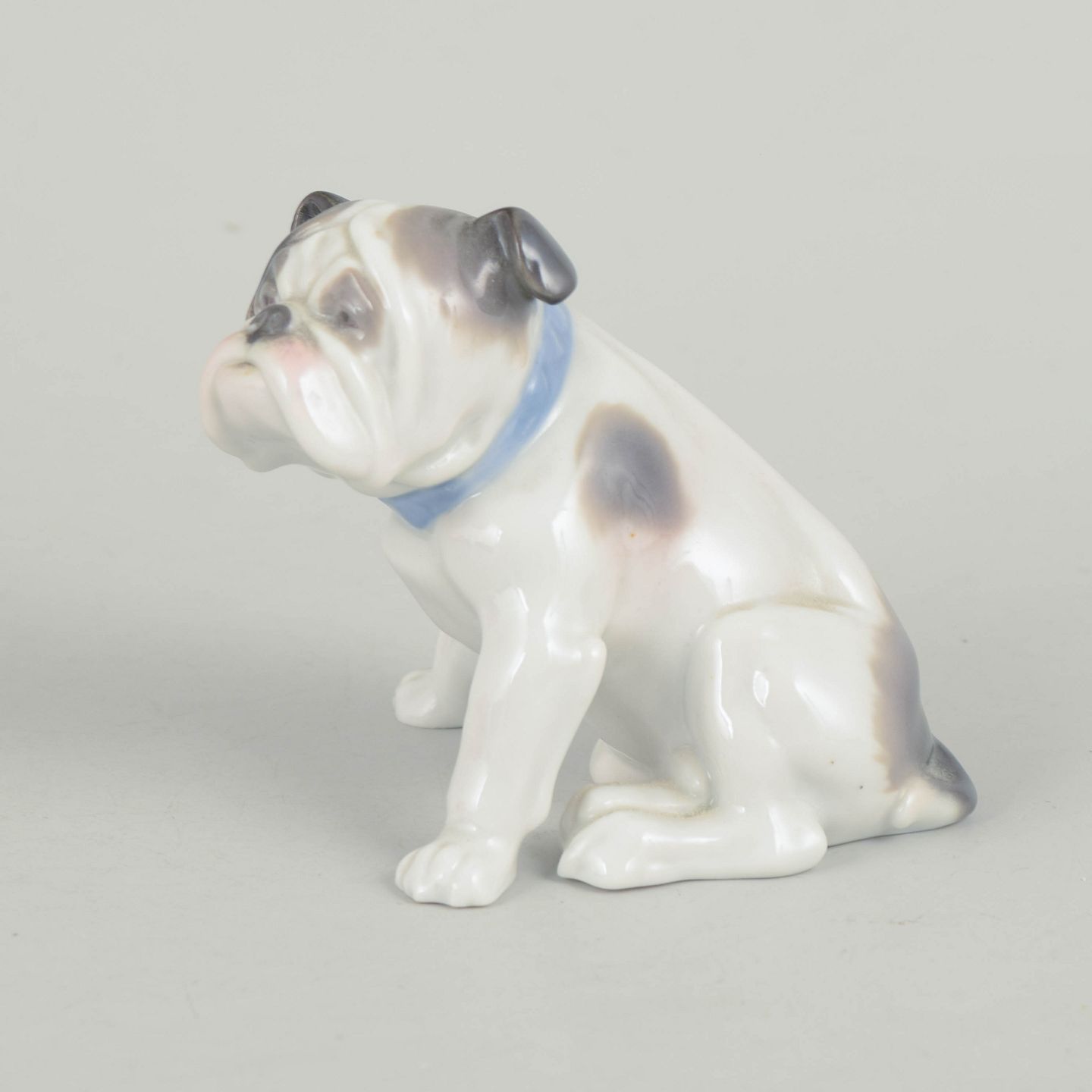 Naturalistisk udformet porcelænsfigur af fransk bulldog med håndmalede detaljer i grå, hvide og rosa nuancer.