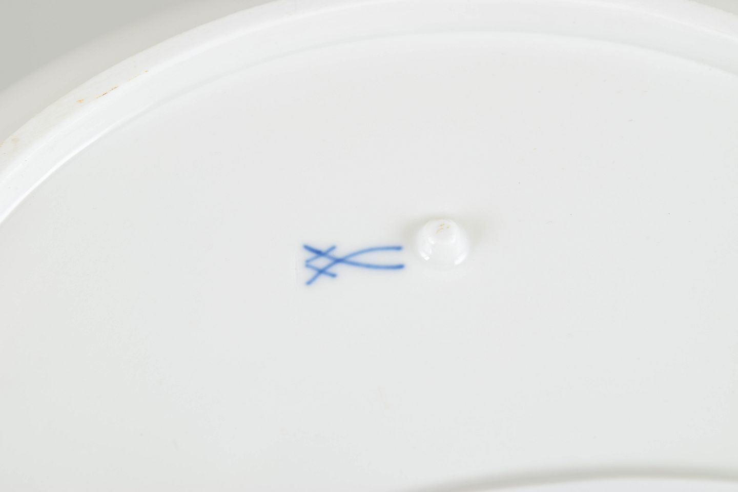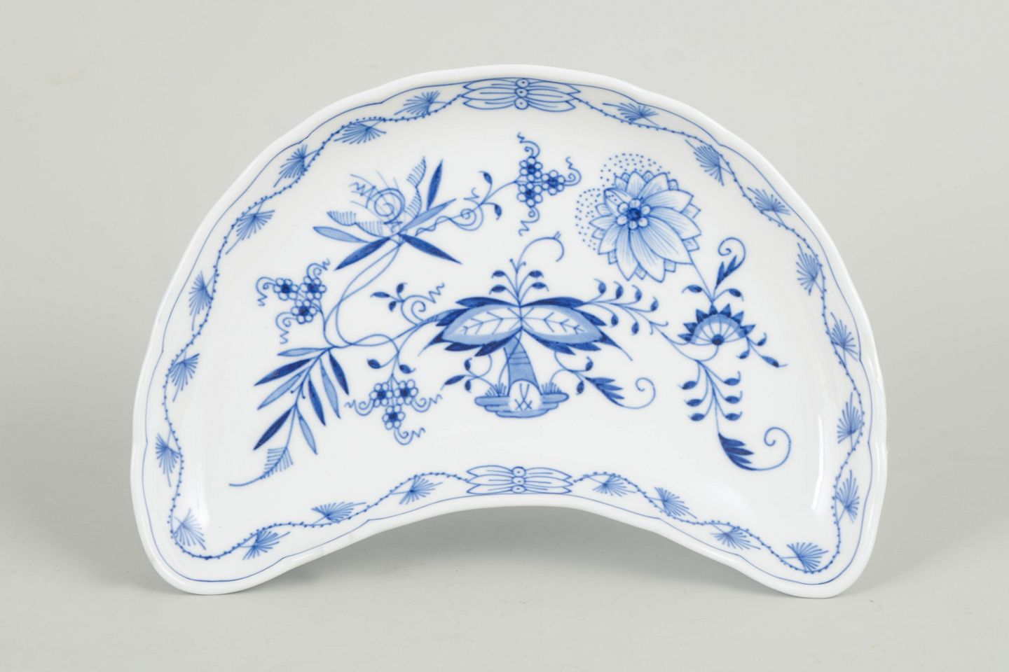 Dekorativt fad i porcelæn med håndmalet blå dekoration i det klassiske løgmønster. Fremstillet hos Meissen i begyndelsen af 1900-tallet og markeret med Meissen krydssværd.