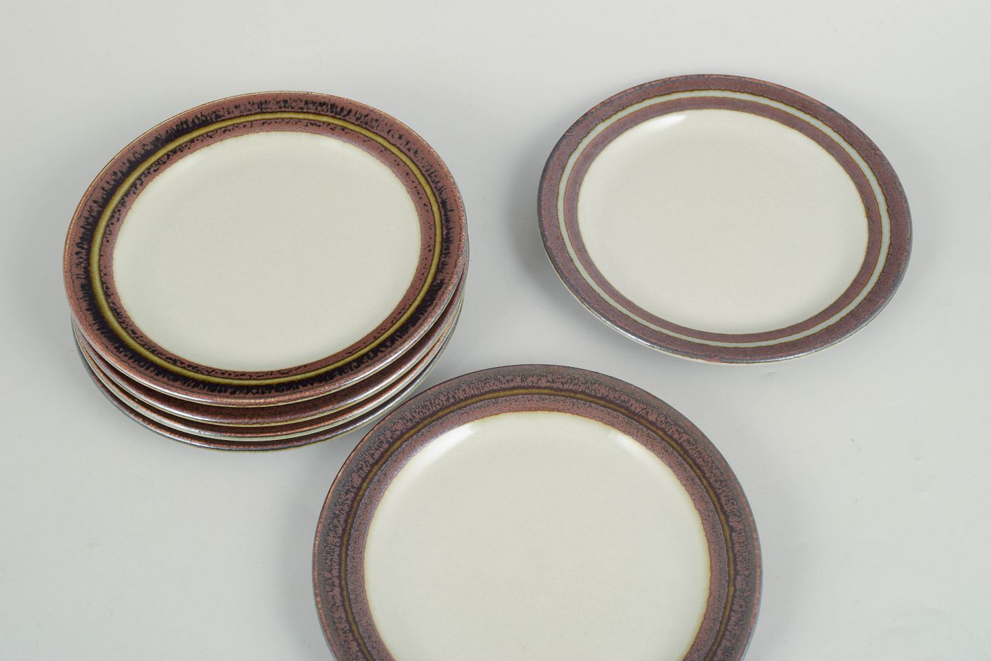 Sæt med seks tallerkener i stentøj fra Arabias Karelia-serie med brun og violet kantdekoration på lys bund.