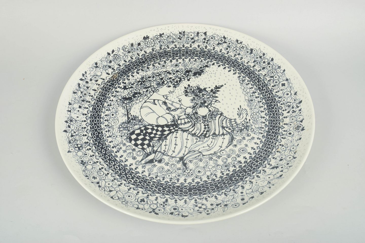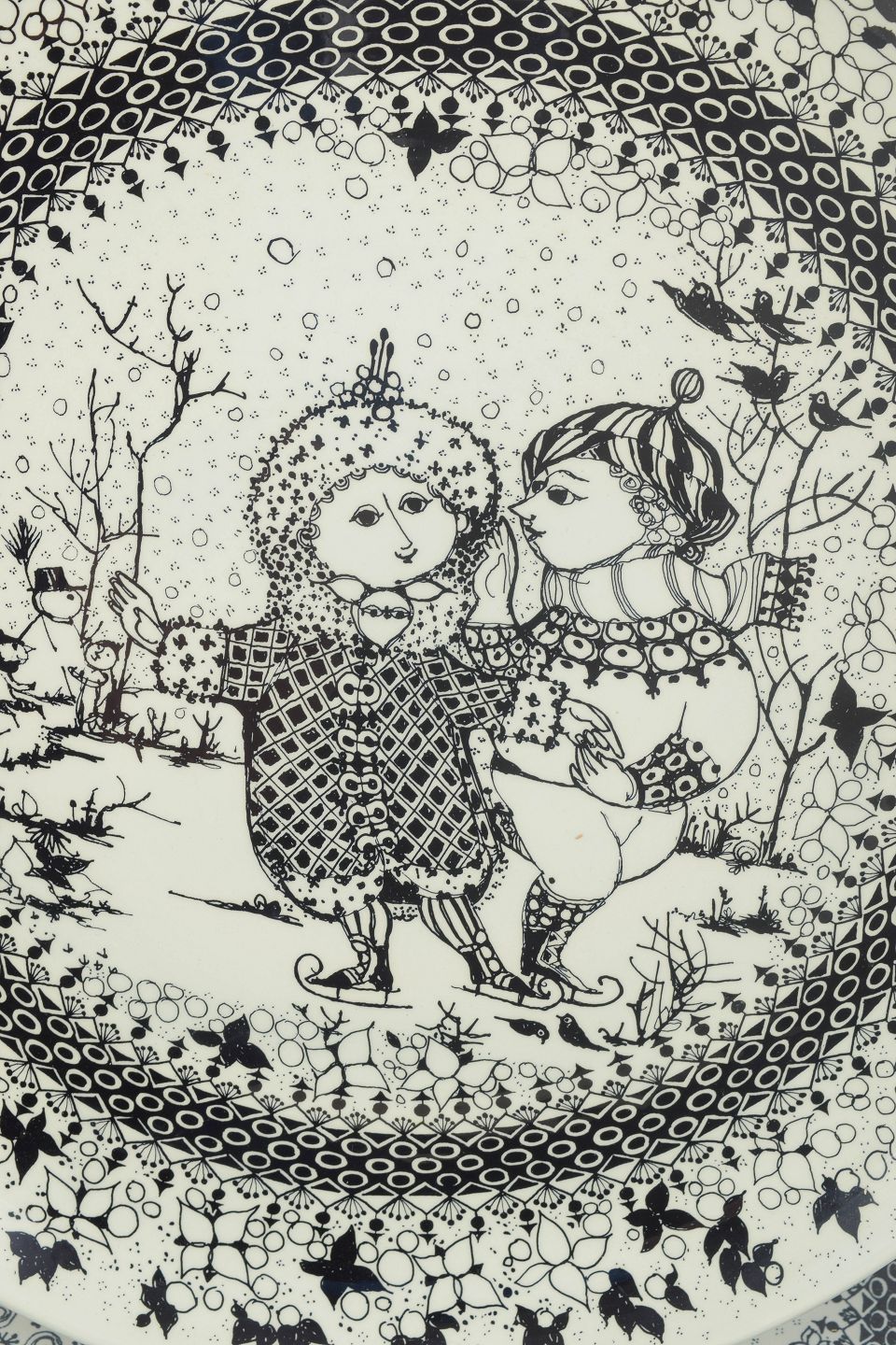 Dekorative runde fade i fajance med sort stregdekoration i Bjørn Wiinblads karakteristiske eventyrlige stil, med figurmotiver og ornamentale borter. Motiverne repræsenterer årstiderne vinter og forår.