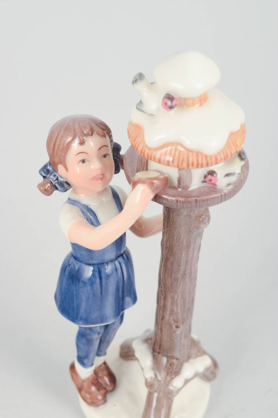 Fin porcelænsfigur af en pige i blå dragt stående ved et fuglehus på træstamme med detaljeret bemaling. Model 757, første sortering.