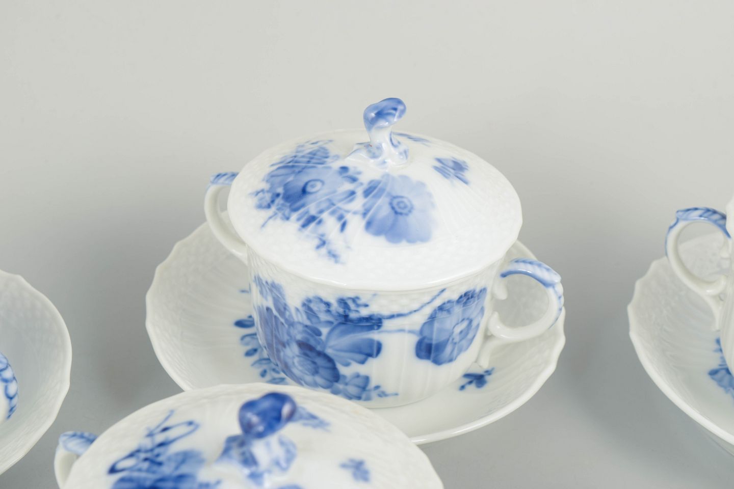 Royal Copenhagen Blå Blomst Svejfet, sæt af fem bouillonkopper med underkopper.
