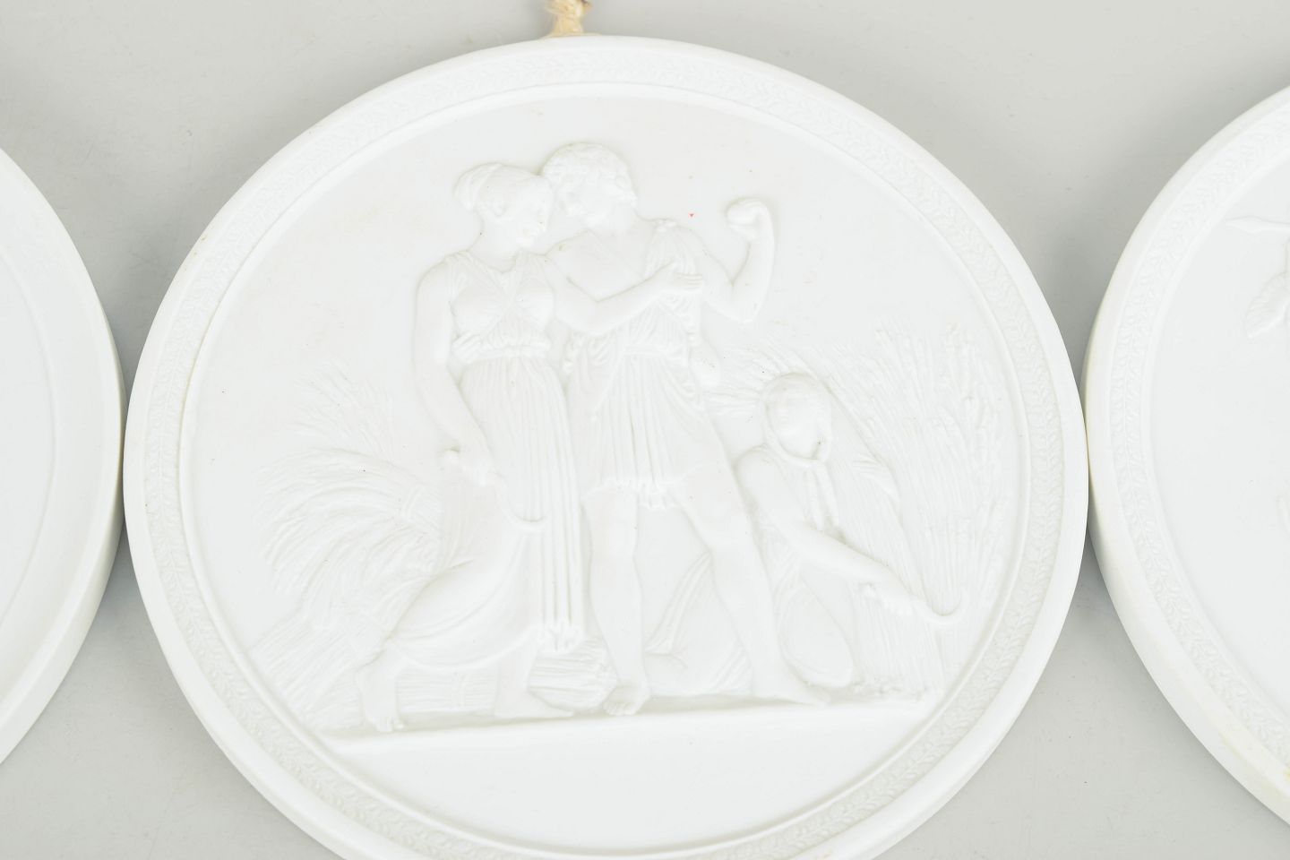 Relieffer i hvidt uglaseret porcelæn med klassiske motiver efter Bertel Thorvaldsen, udført i fin biscuit med detaljeret figurdekoration og ophæng på bagsiden. Første og tredje sortering.