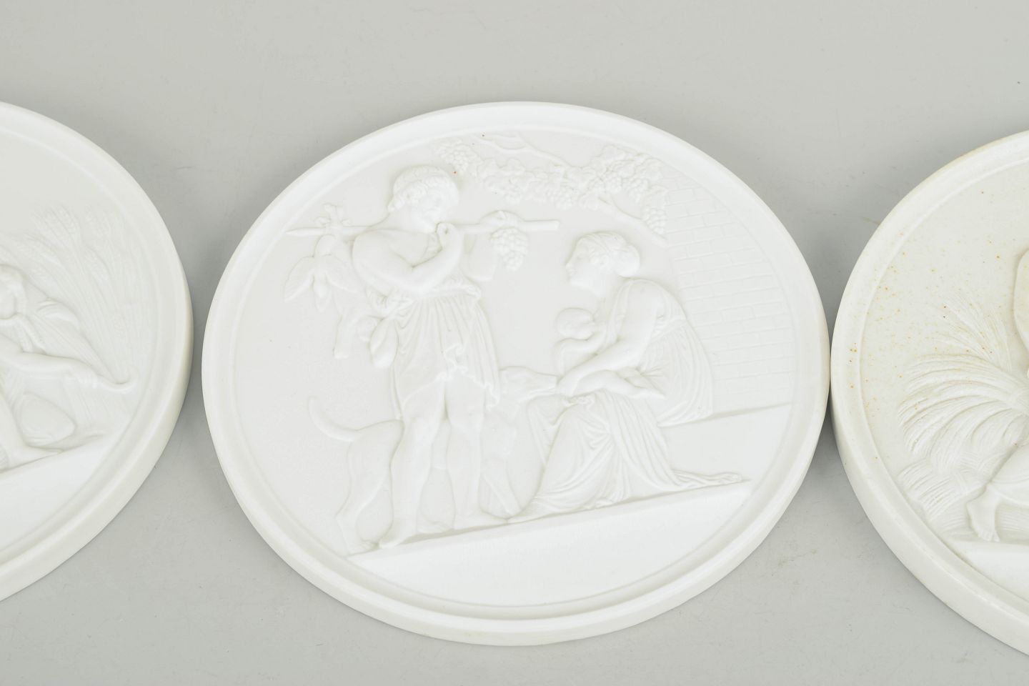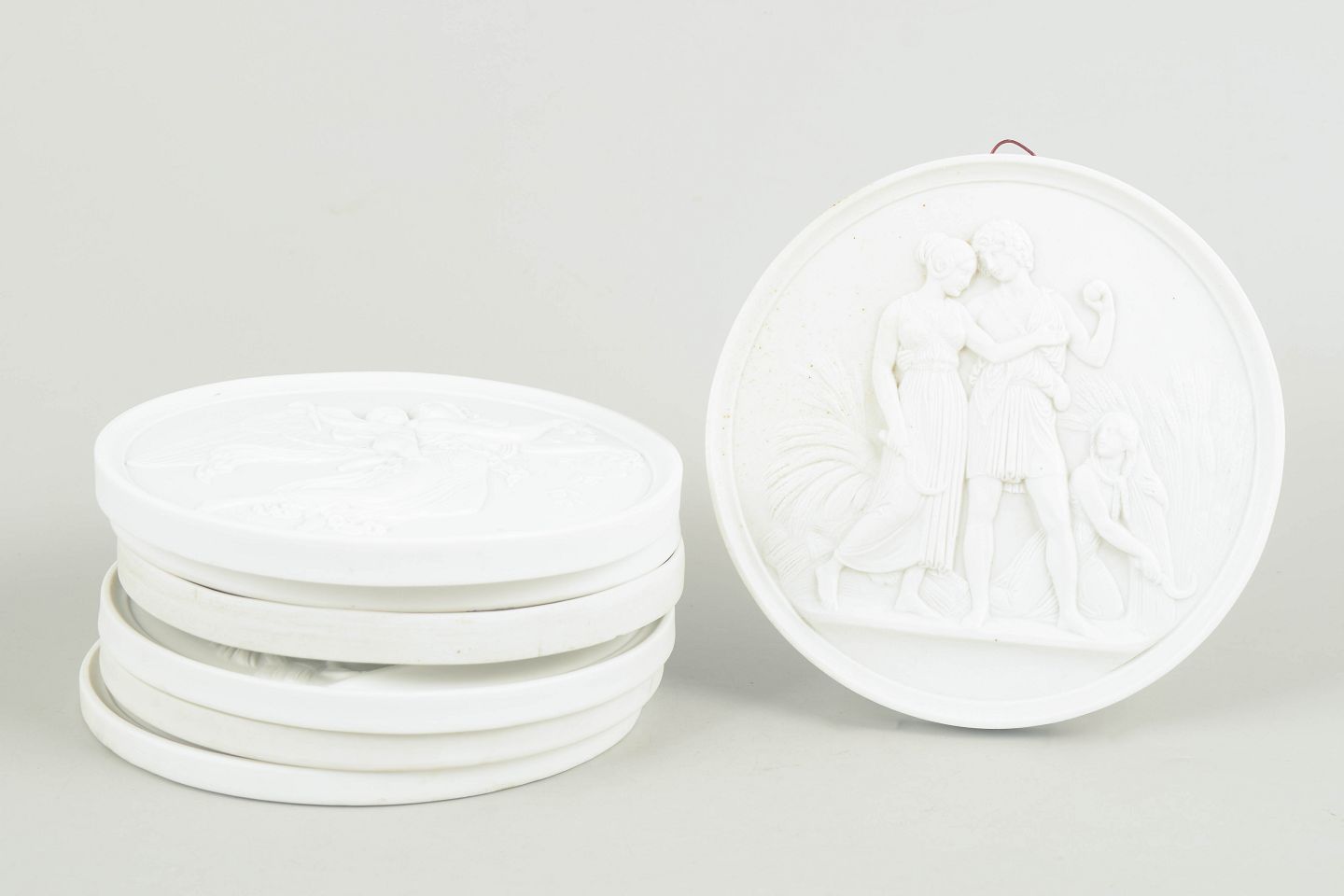 Relieffer i hvidt uglaseret porcelæn med klassiske motiver efter Bertel Thorvaldsen, udført i fin biscuit med detaljeret figurdekoration og ophæng på bagsiden. Første sortering.