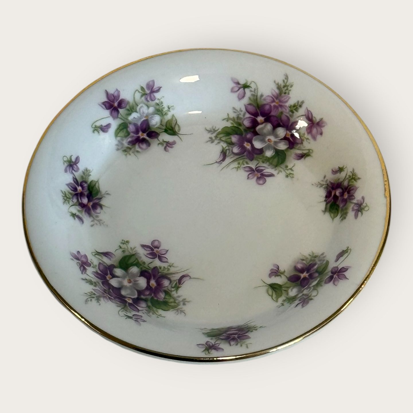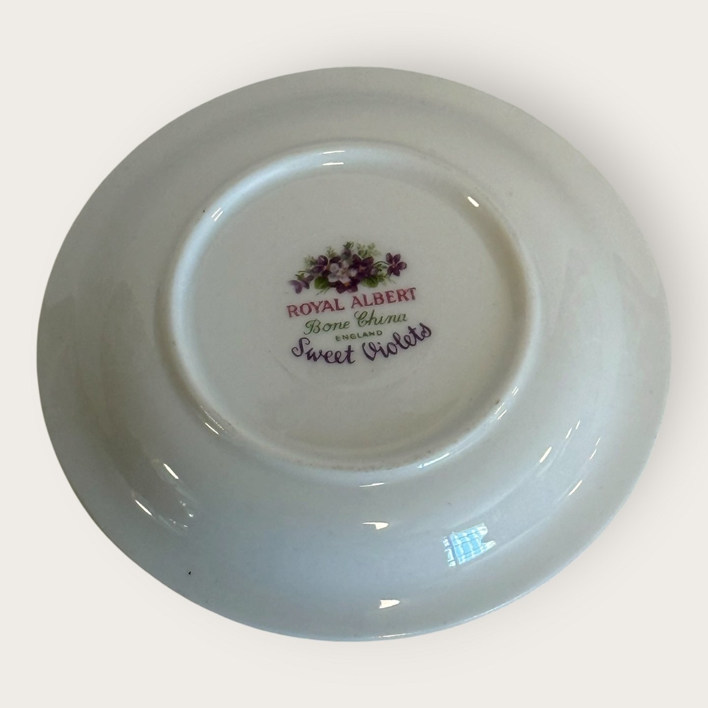 Royal Albert, Bone China, Sweet violets, Mark viol, lille asiet, kuvertsmør, diameter 9cm*Perfekt stand*