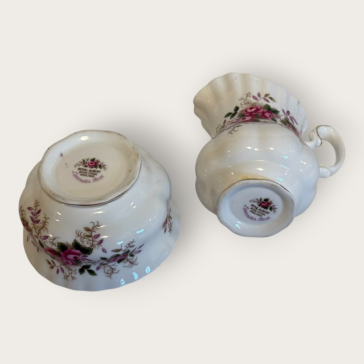 | Royal Albert, Bone China, Lavender Rose, Sukker og flødesæt, sukkerskål højde 5,5cm, diameter 9,5cm, flødekande ca. hxbxl 9x10x7cm *Perfekt stand*