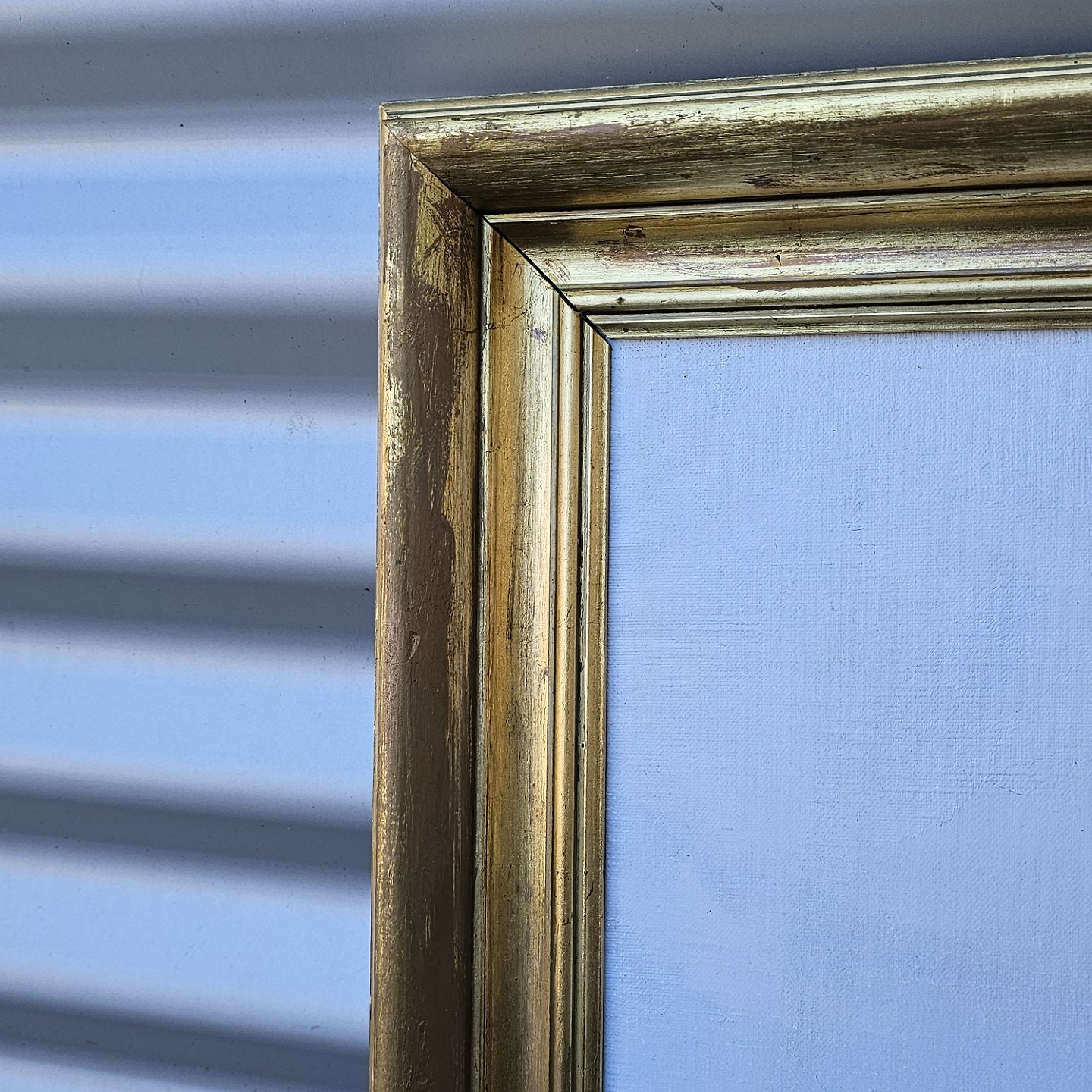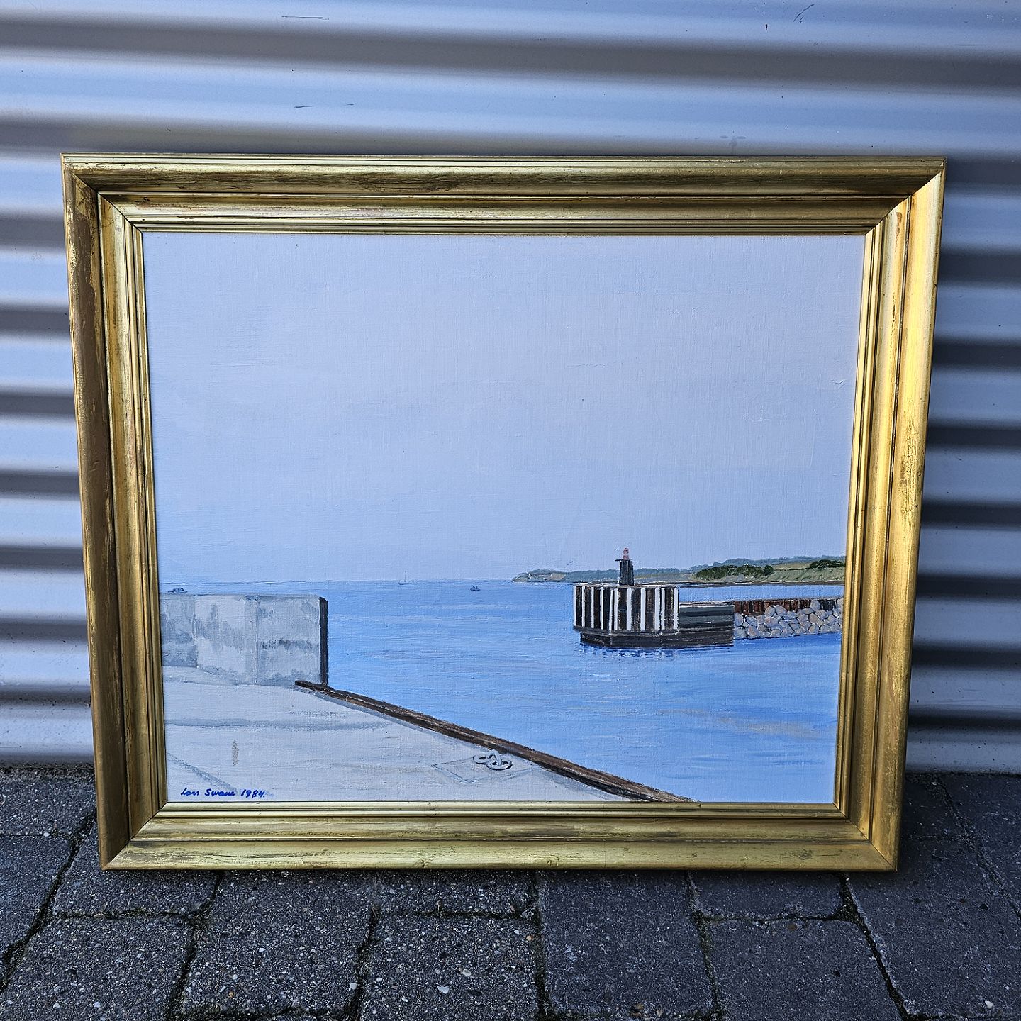 Oliemaleri på lærred med motiv af en havn monteret i guldmalet træramme