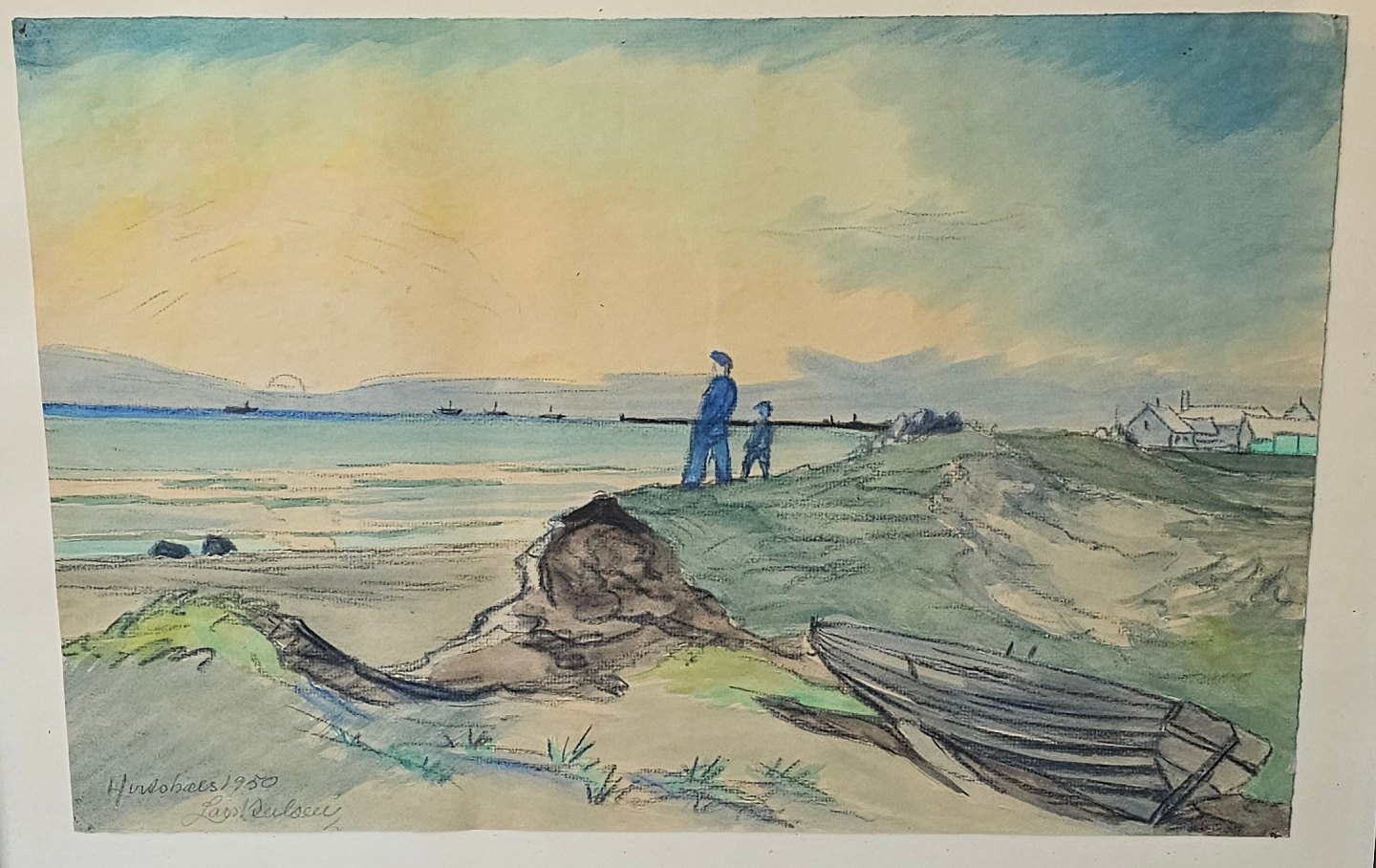 Akvarel maleri på papir med motiv af en mand og en dreng, som kigger ud over havet. Monteret i sortmalet træramme, dateret 1950