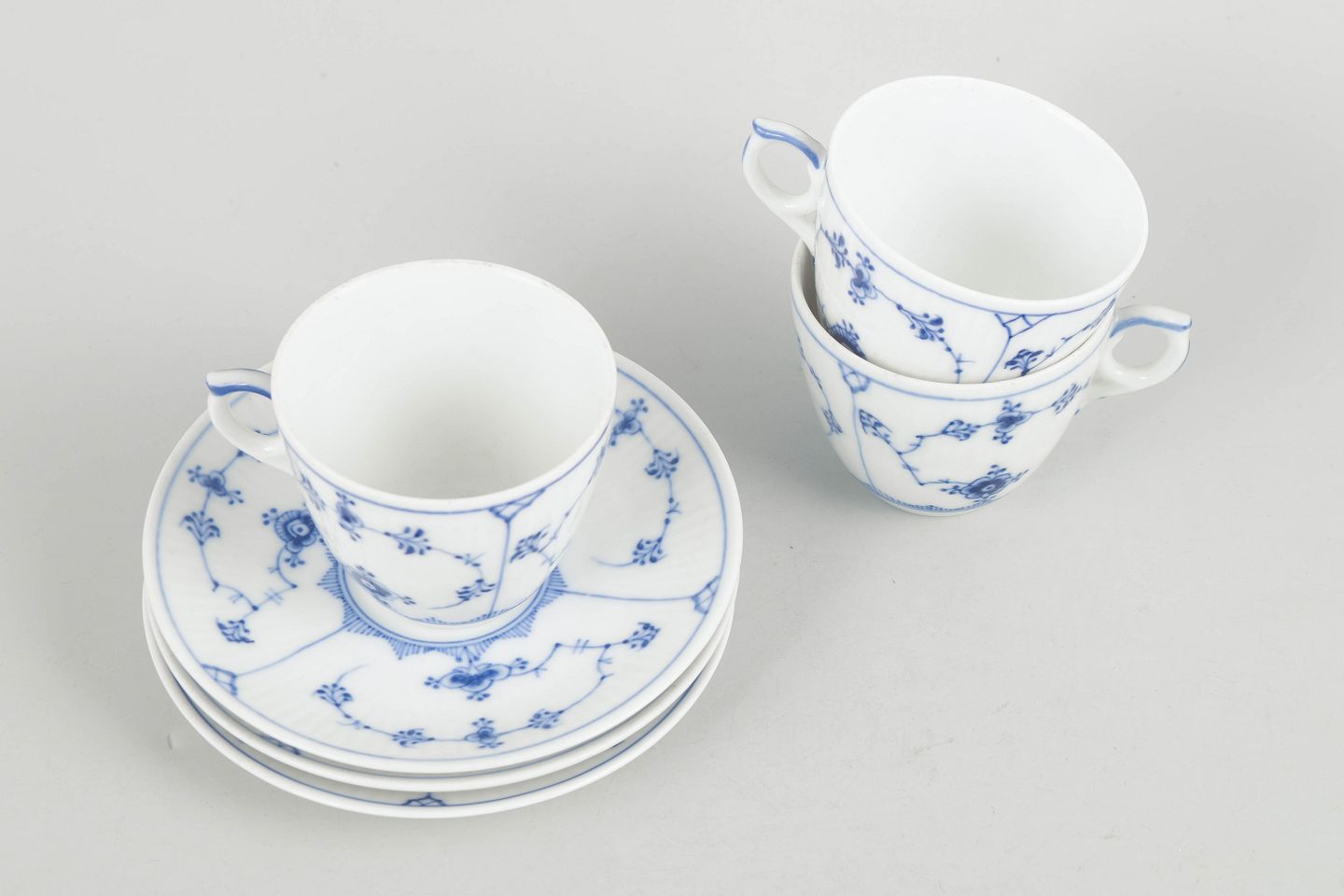Royal Copenhagen Musselmalet Riflet, sæt af tre kaffekopper med underkopper.