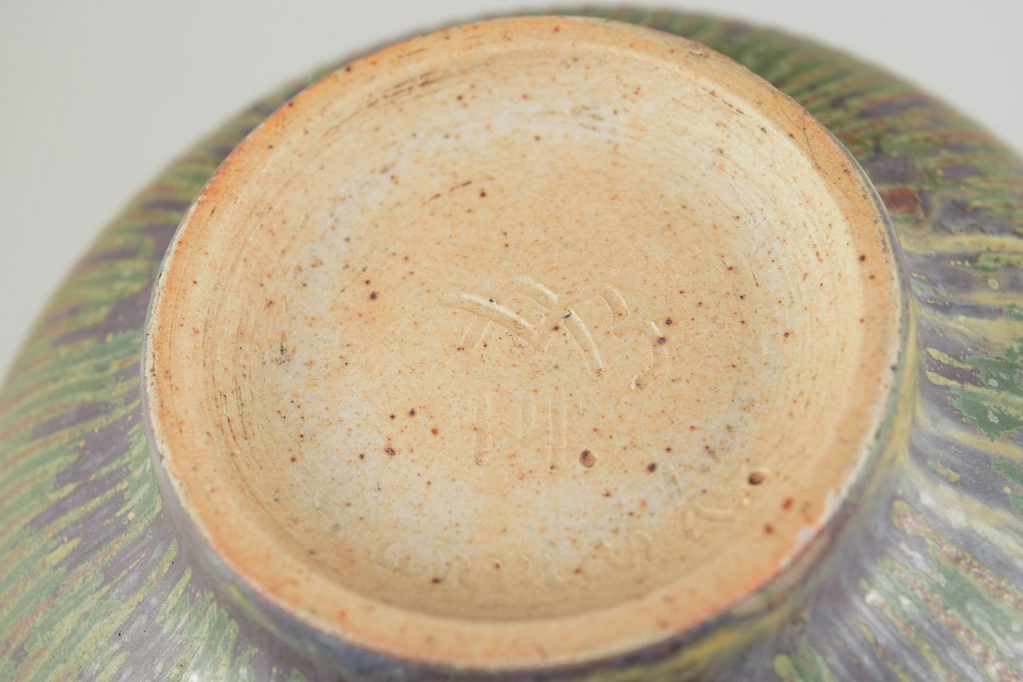 Rund skål i stentøj med riflet korpus og levende glasur i grønne og rosa nuancer. Model 111.