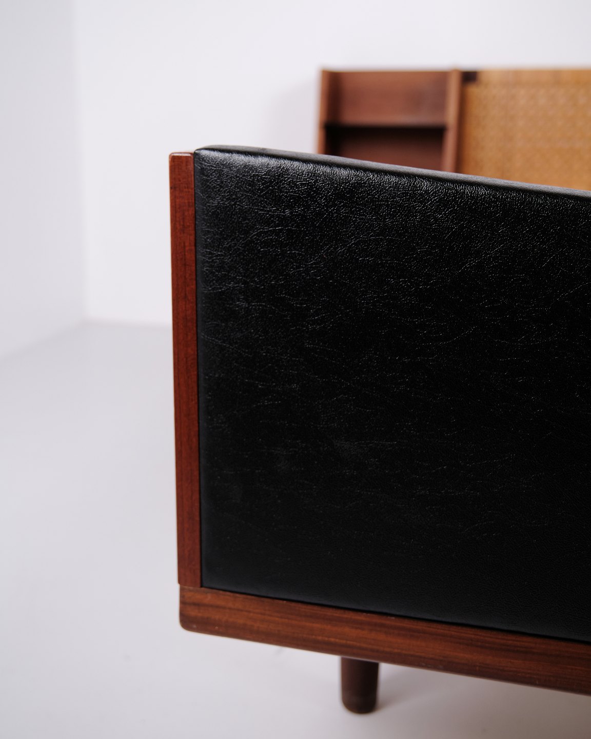 Model GE 701 dobbeltseng designet af Hans J. Wegner og fremstillet hos Getama i 1950’erne. Udført i fineret og massivt teaktræ. Gavle med sjeneflet og sort kunstlæder. Hovedgavl med integrerede sengeborde med hylder i sort glas samt underliggende hylde. Messingbeslag. Hans J. Wegner samarbejdede gennem mange år med Getama og udviklede flere møbler i teak til boligindretning og soveværelse.
