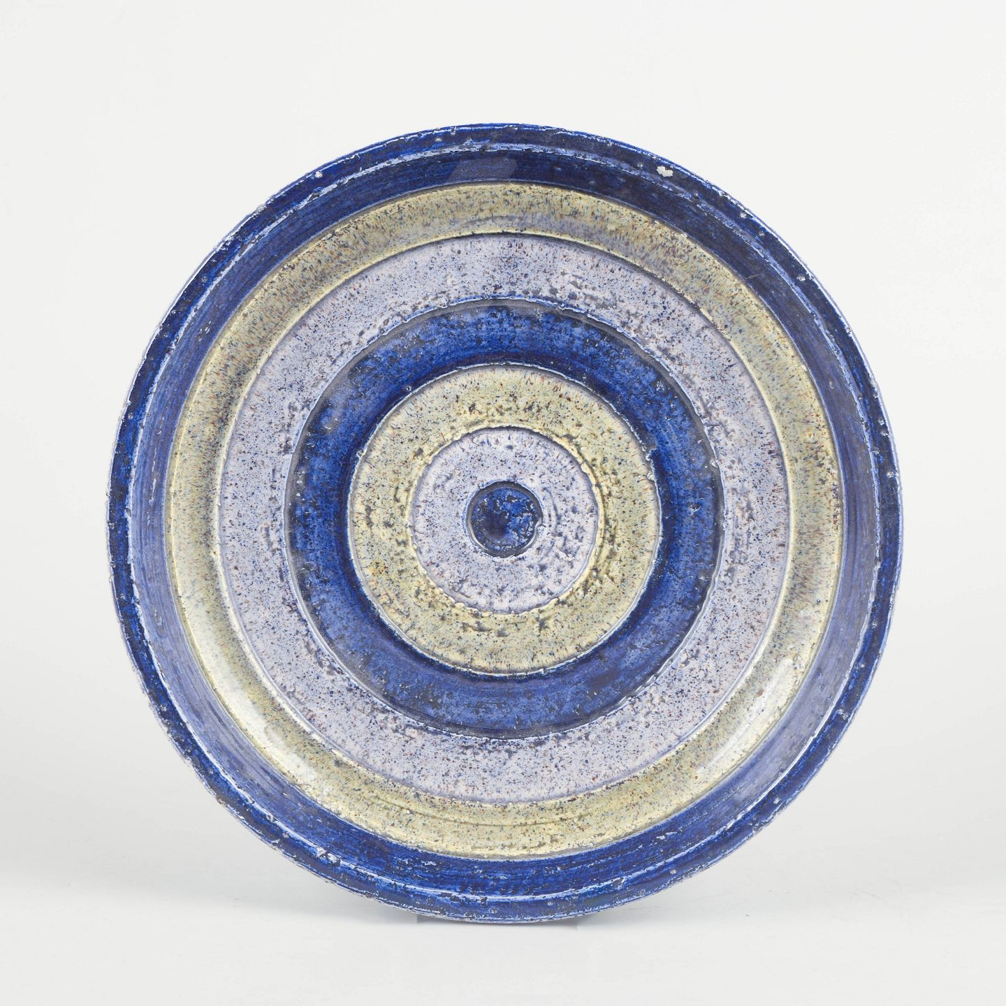 Håndlavet rundt fad i keramik med koncentriske ringe og karakteristisk glasur i blå, creme og sandfarvede nuancer. Udført i 1970’erne i Bitossis velkendte kunstneriske stil.