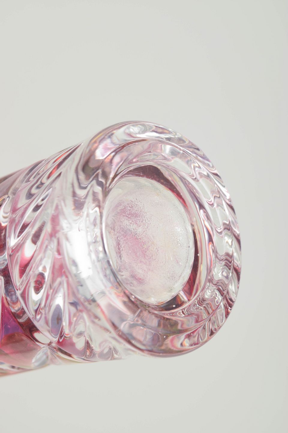 Presset og slebet krystal i klart og rosa tonet glas med spiralformet og geometrisk slebet dekor.
