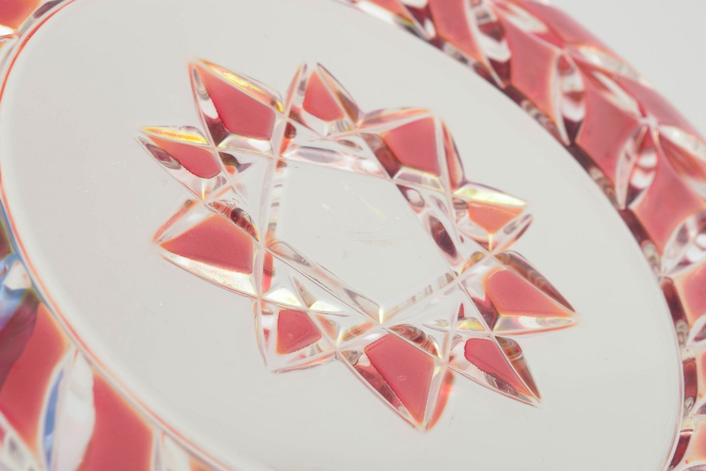 Pressede og slebne glasfade i klart og rosa tonet krystal med geometrisk stjernedekor og facetslebne kanter.