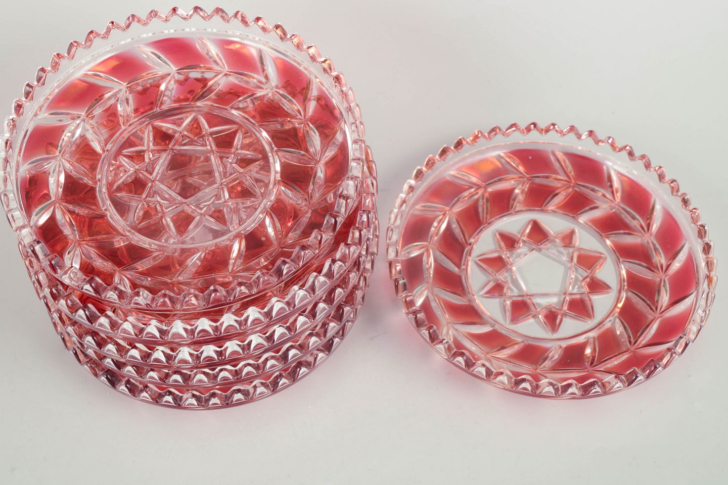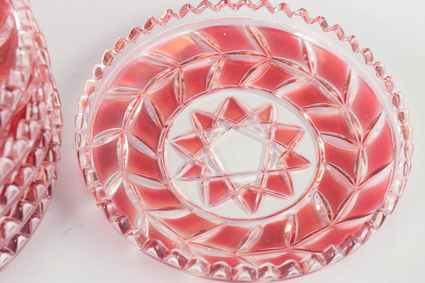 Pressede og slebne glasfade i klart og rosa tonet krystal med geometrisk stjernedekor og facetslebne kanter.