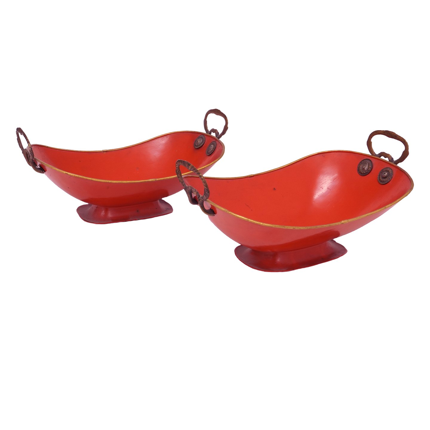 Et par brødbakker i bemalet metal. Danmark ca. år 1840. H hank: 12cm. L: 26cm