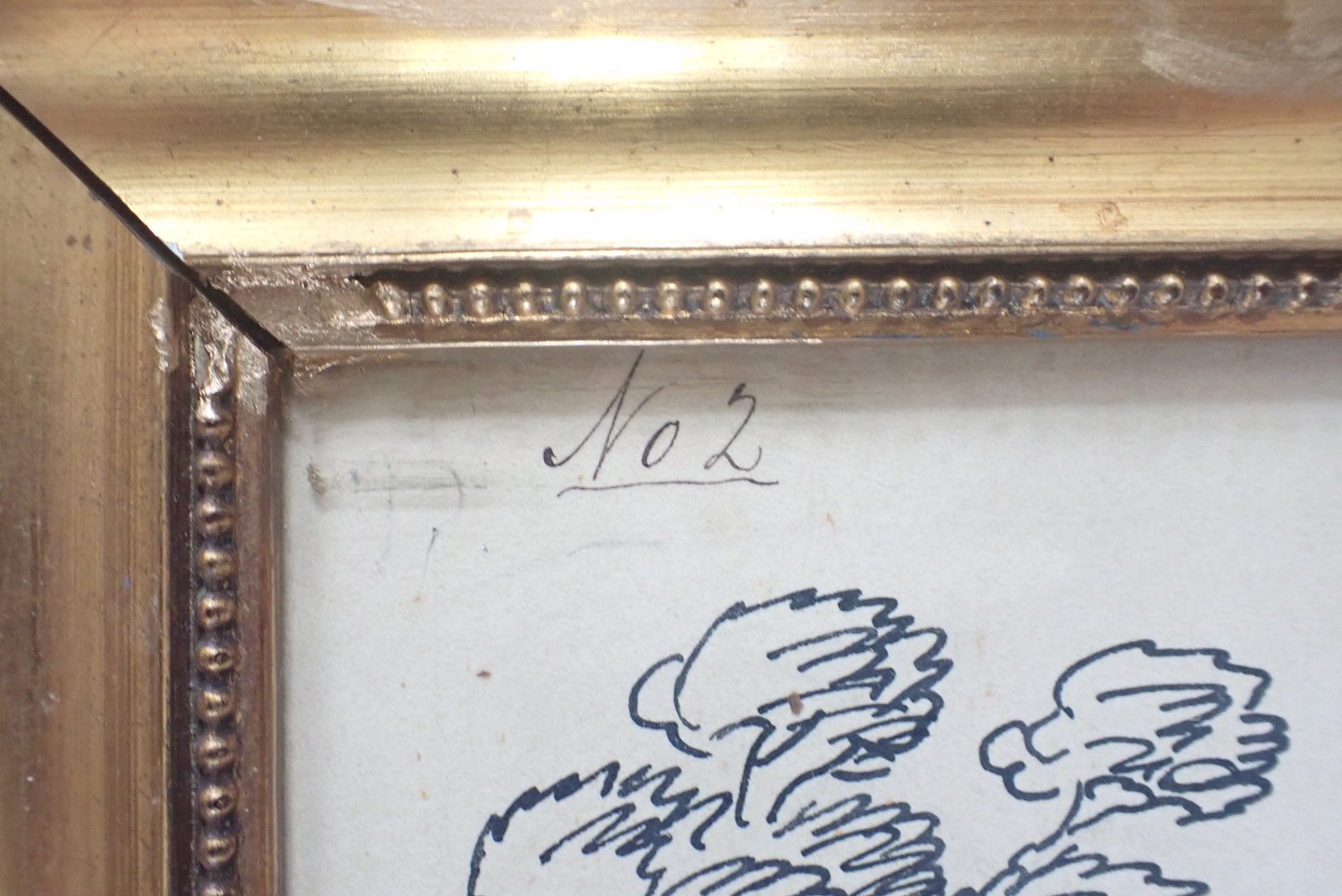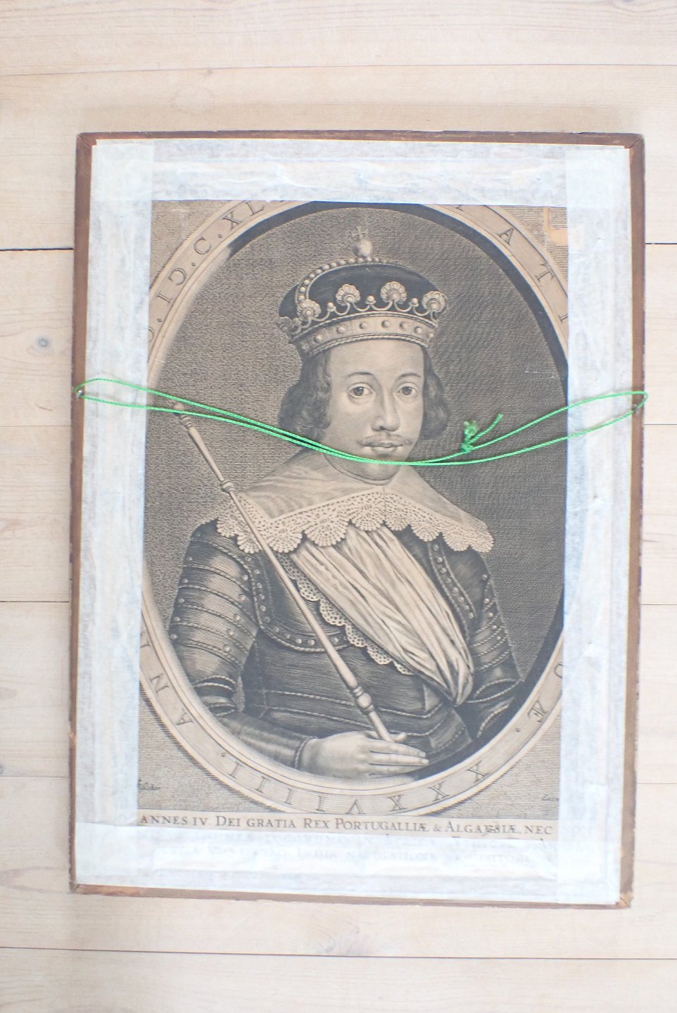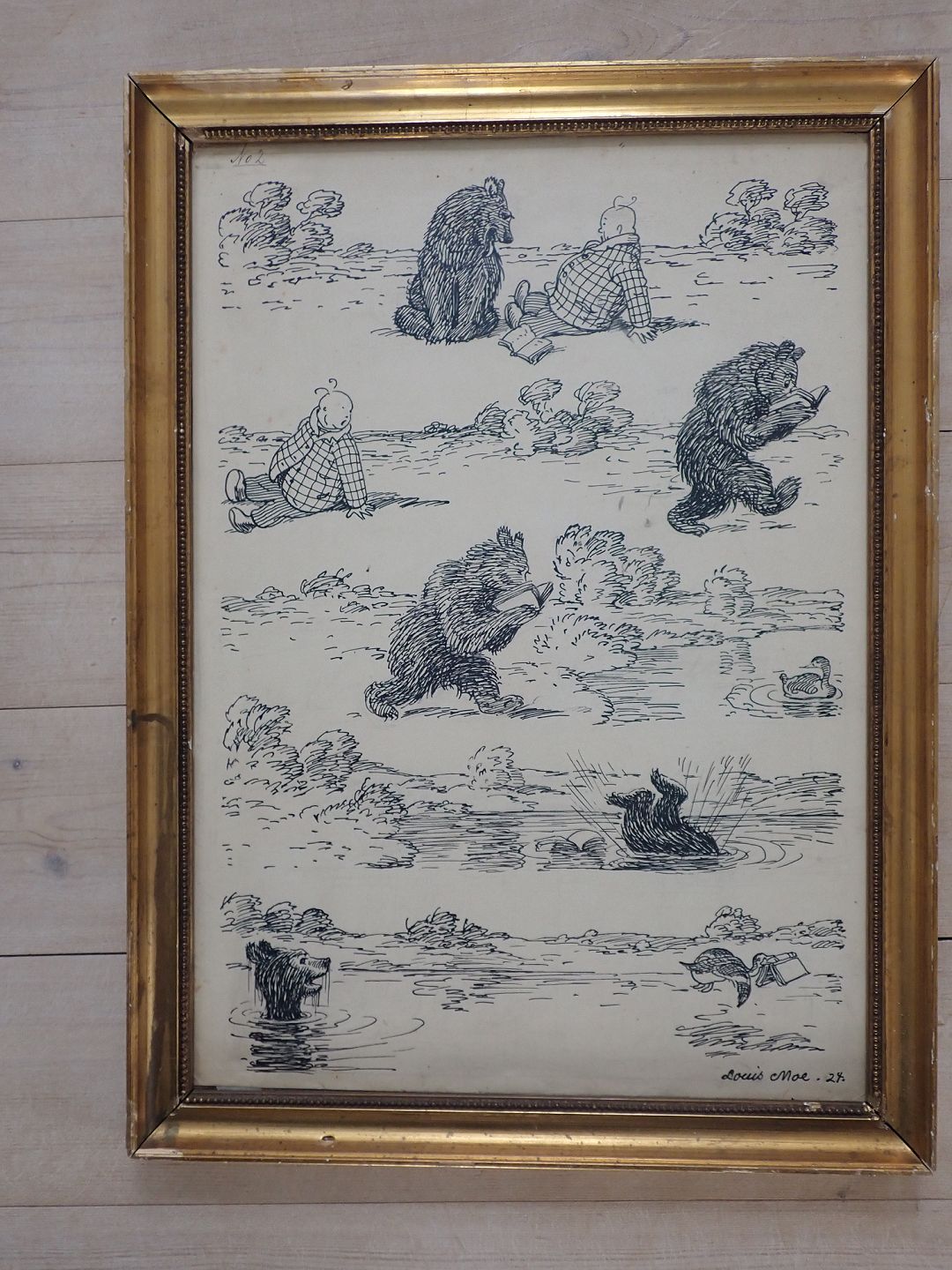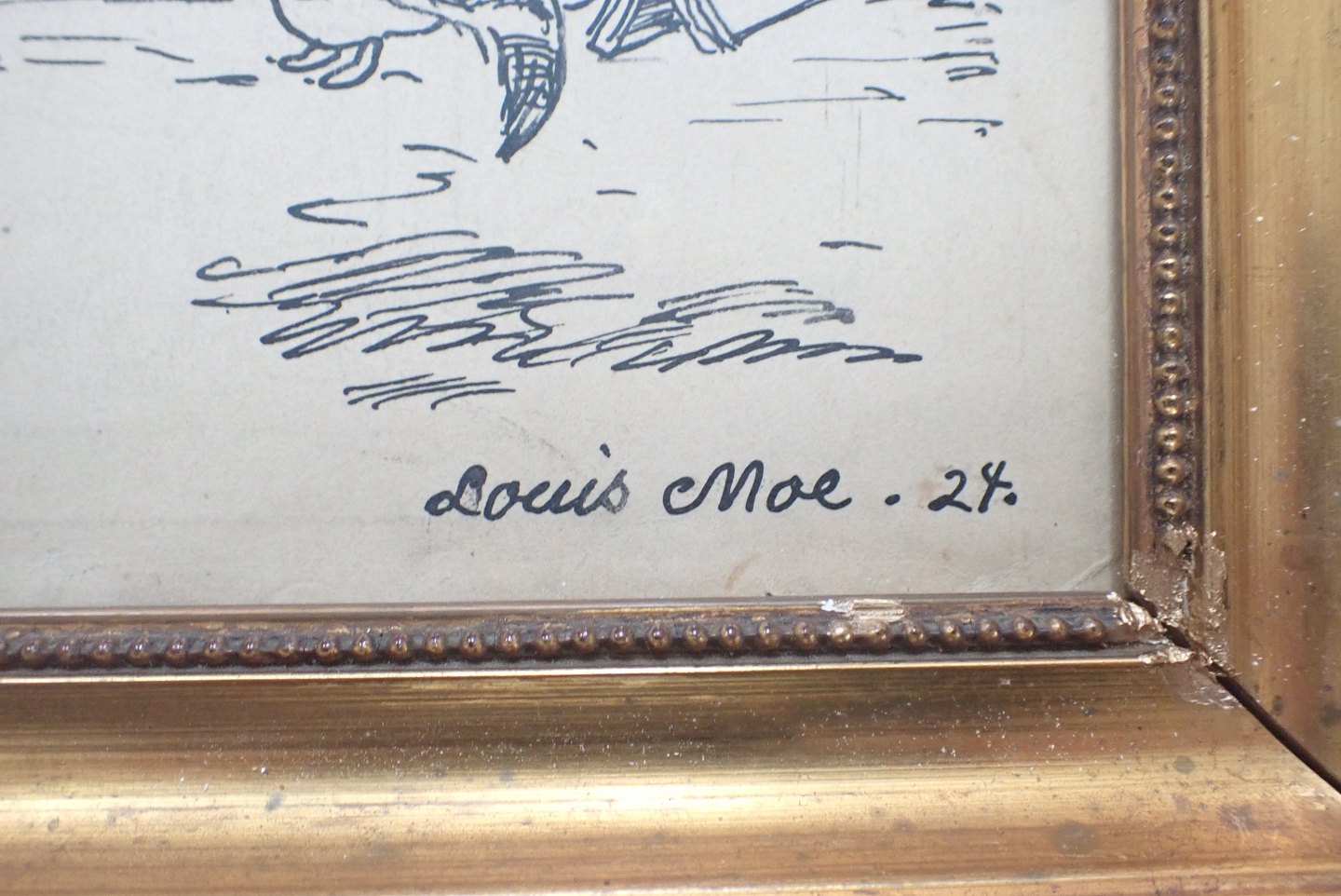 Louis Moe (1857 -1945) - Indrammet humoristisk tushtegning på papir Signeret Louis Moe - 24. Mål: 42 x 30 cm (47 x 34). Bagsiden består pap påklistret en radering af en portugisisk konge. I pæn stand, svagt guldnet.