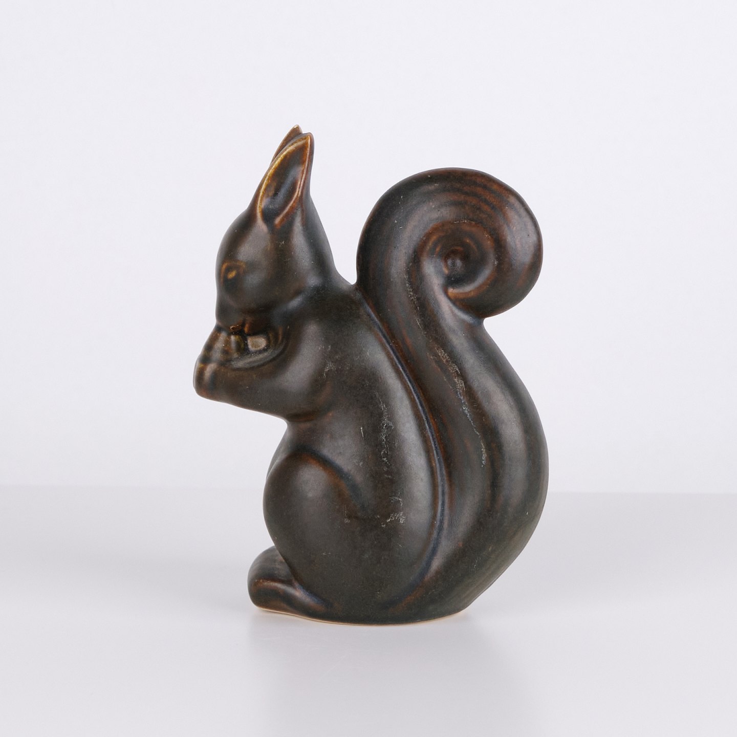 Keramisk egernfigur af Knud Basse udført i mørk glasur med varme brune nuancer. Figuren viser et siddende egern med nød og fremstår med markante organiske linjer, som kendetegner dansk studiokeramik fra perioden. Knud Basse figurer er kendte samlerobjekter inden for dansk dyrekeramik.