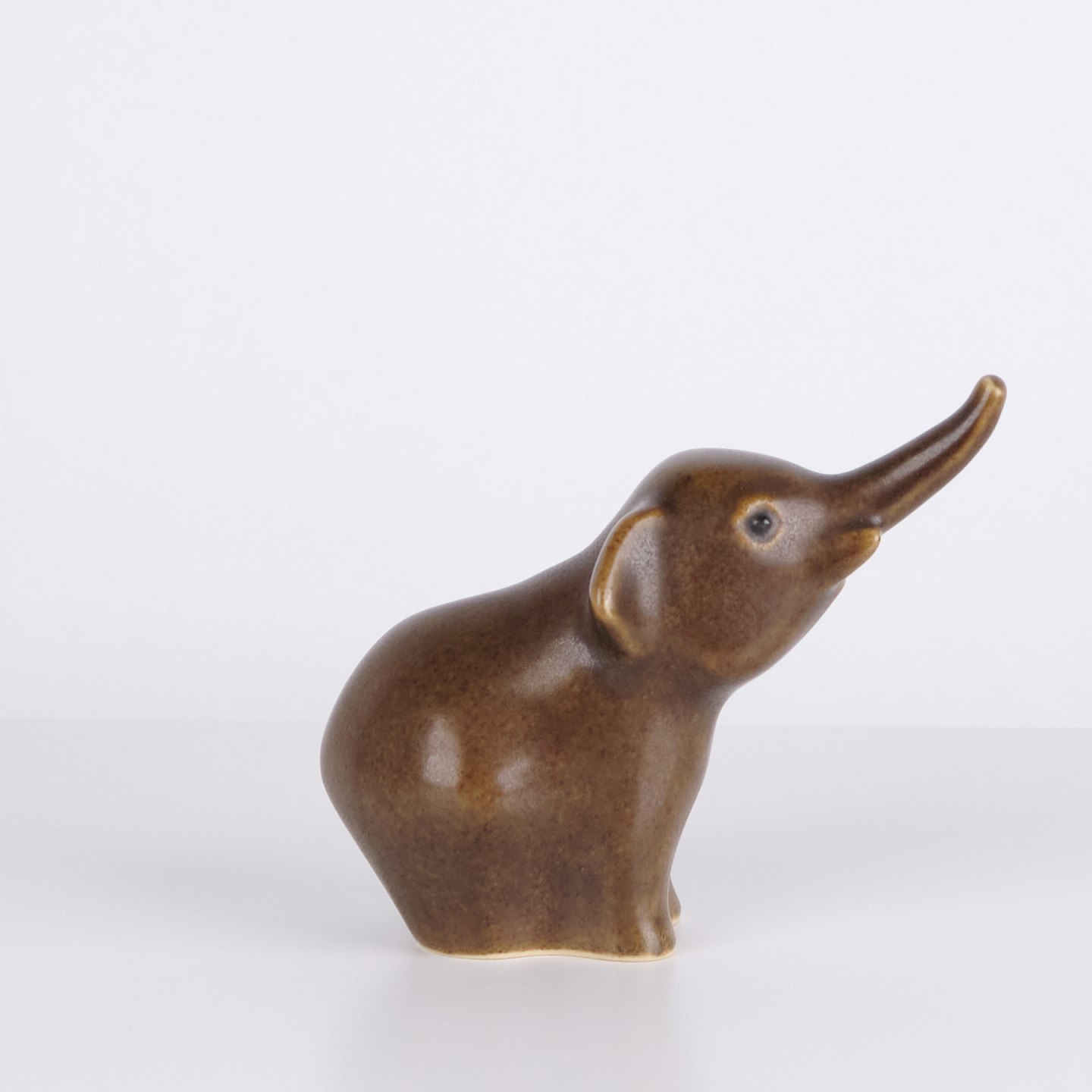 Elefantfigur af Knud Basse udført i brun glaseret keramik. Figuren er modelleret med løftet snabel og afrundede former, som giver et levende og dekorativt udtryk. Et klassisk eksempel på dansk dyrekeramik, hvor enkle linjer og karakterfulde motiver er i fokus. Eftertragtet figur blandt samlere af Knud Basse og dansk keramik.