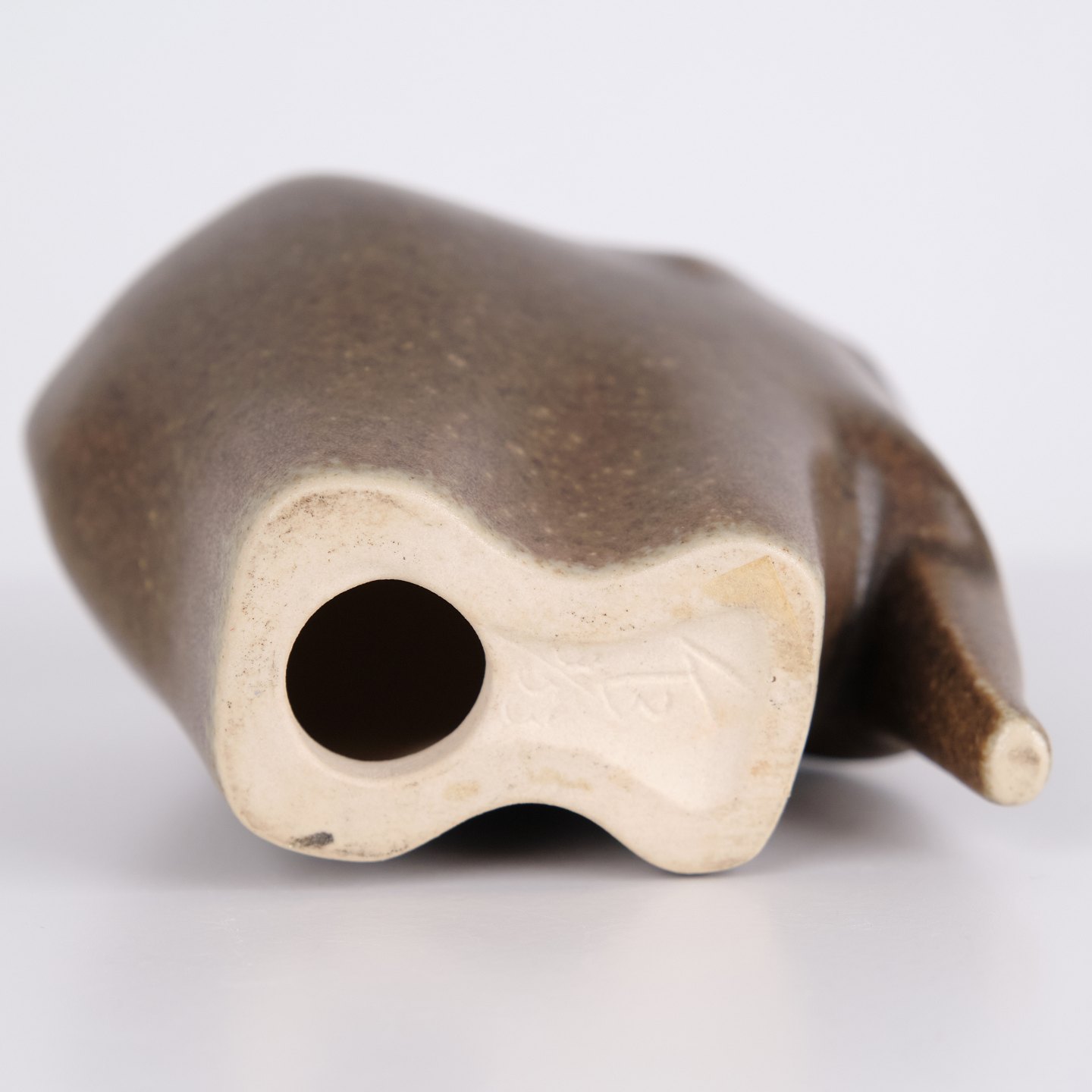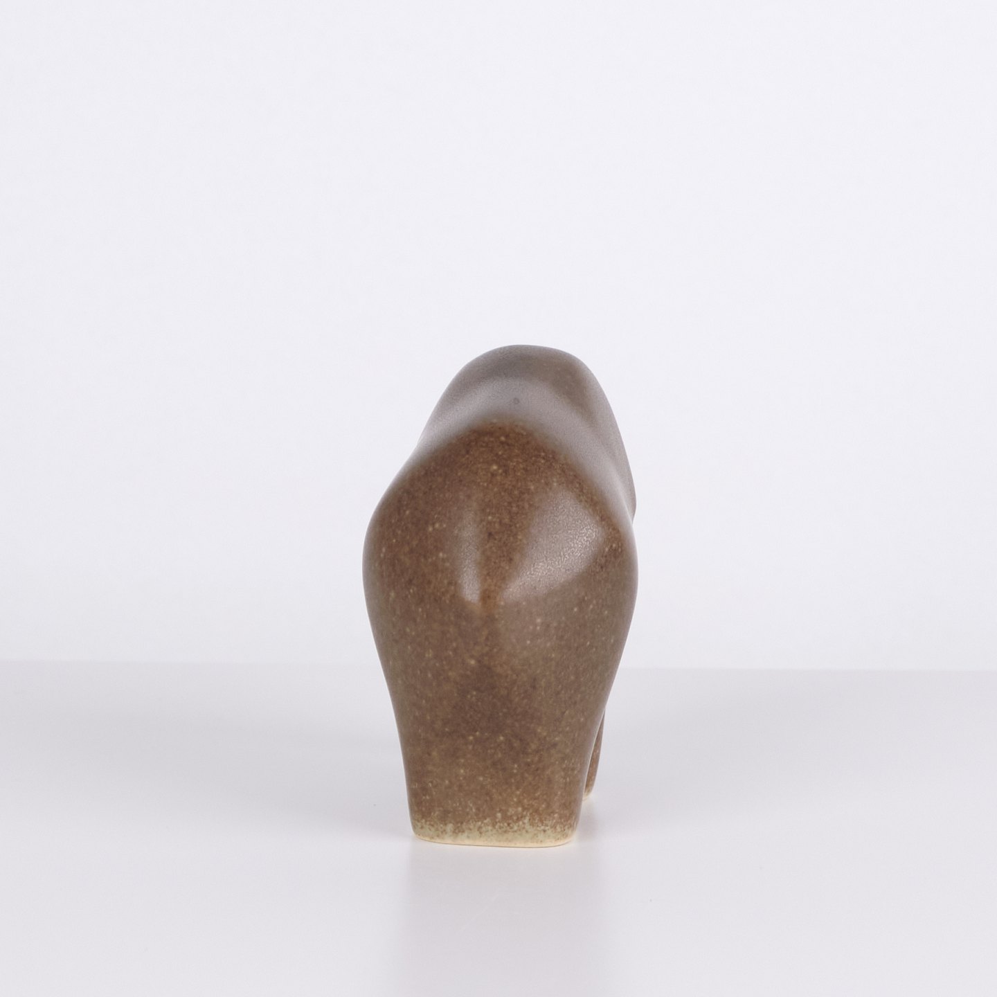 Elefantfigur af Knud Basse udført i brun glaseret keramik. Figuren er modelleret i enkel kompakt form med nedadbøjet snabel og afrundede sider. Minimalistisk model fra Knud Basses serie af dyrefigurer, produceret i Danmark i 1960’erne.