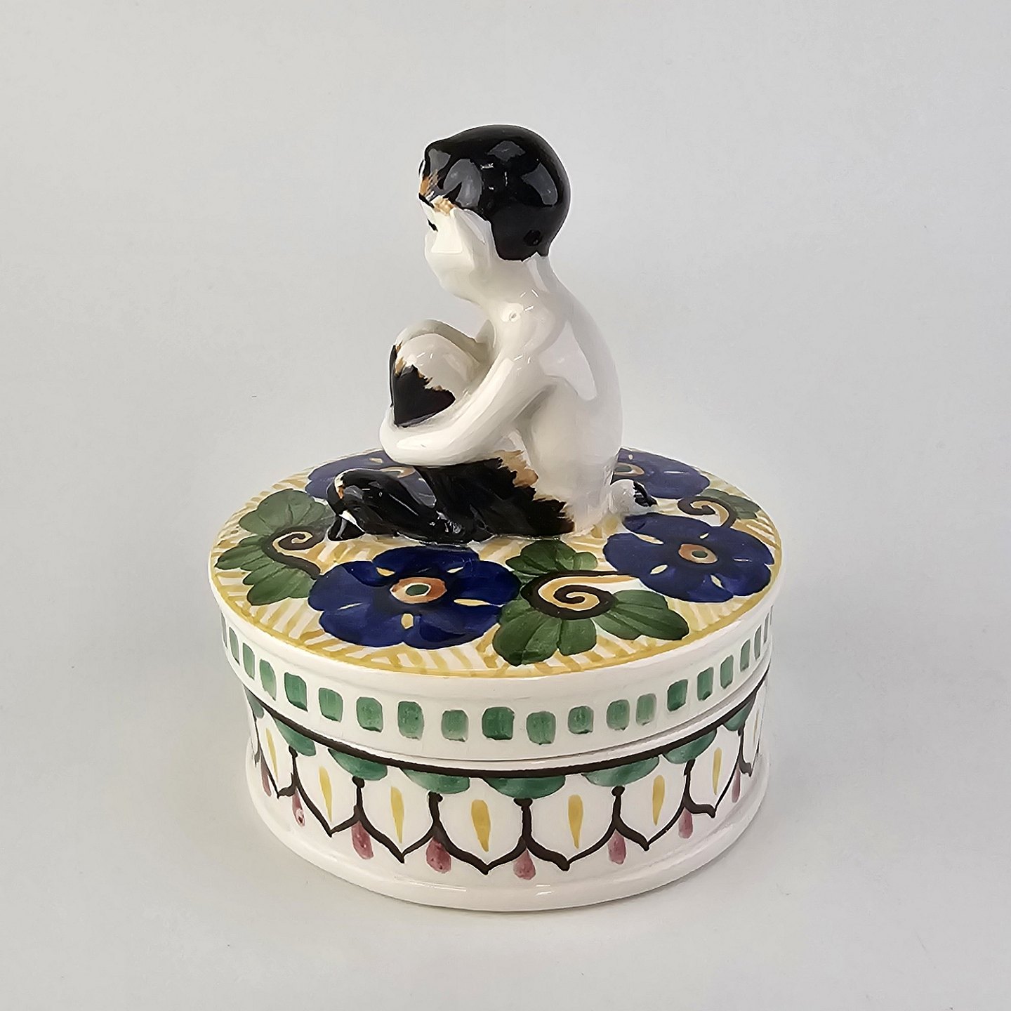 Krukke med låg i fajance med dekoration af blomster og en figur af en faun på låget