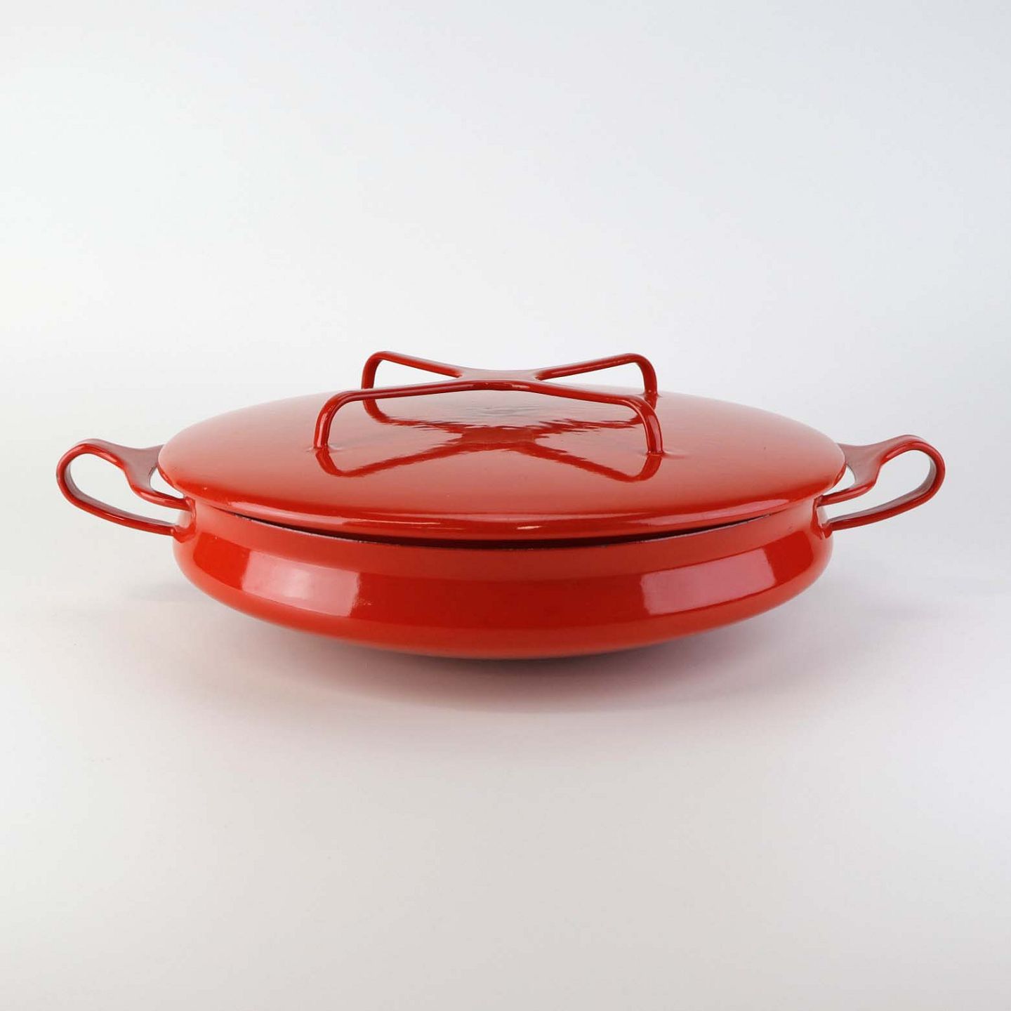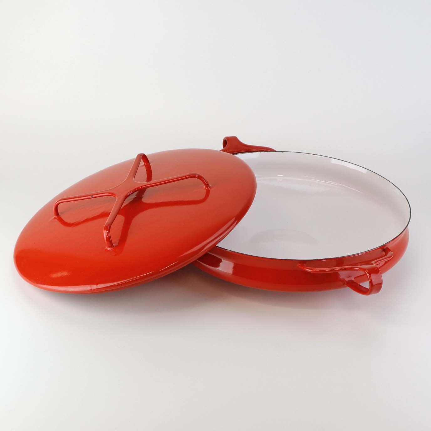 Kasserolle med låg fra serien Kobenstyle fremstillet i metal og belagt i rød og hvid emalje. Model France