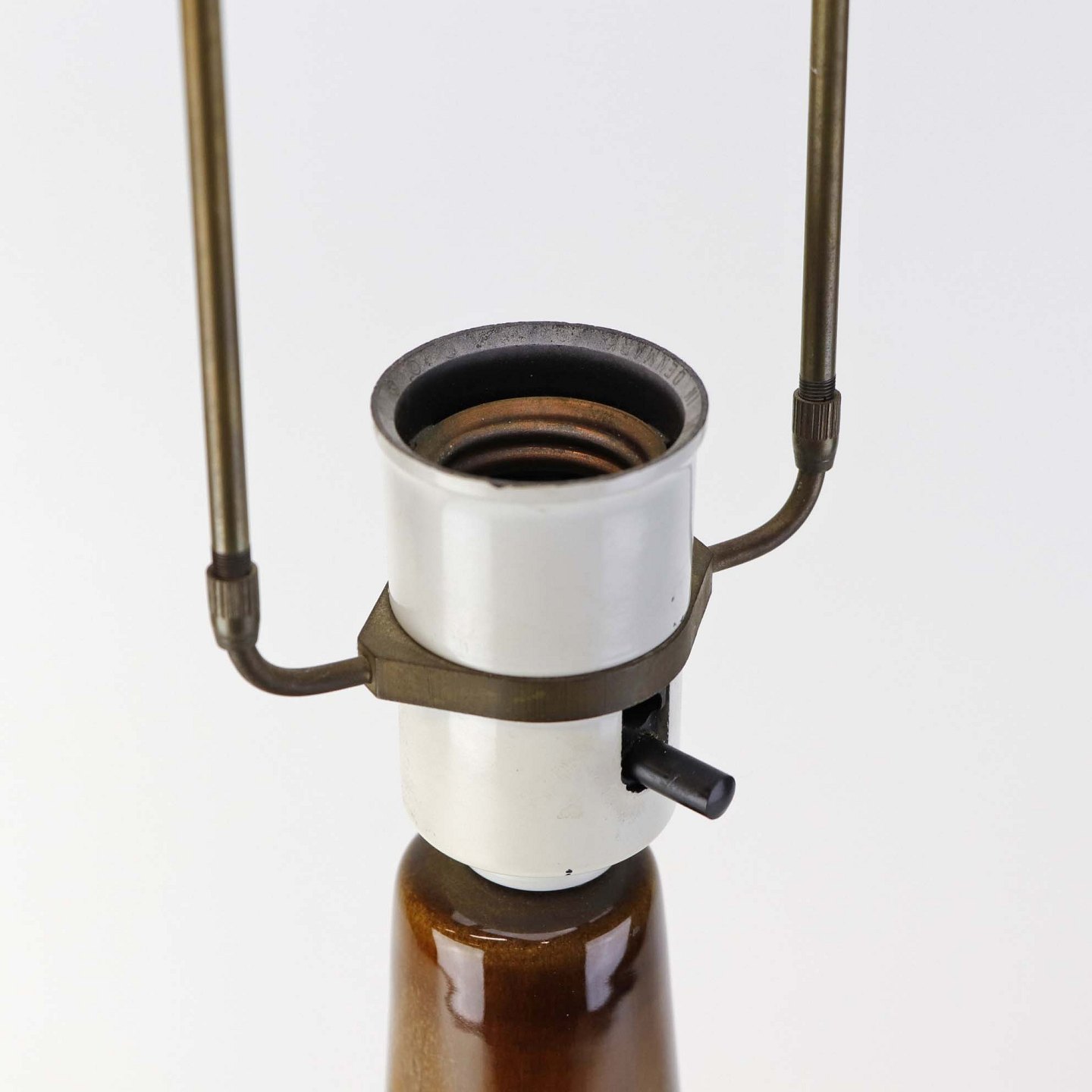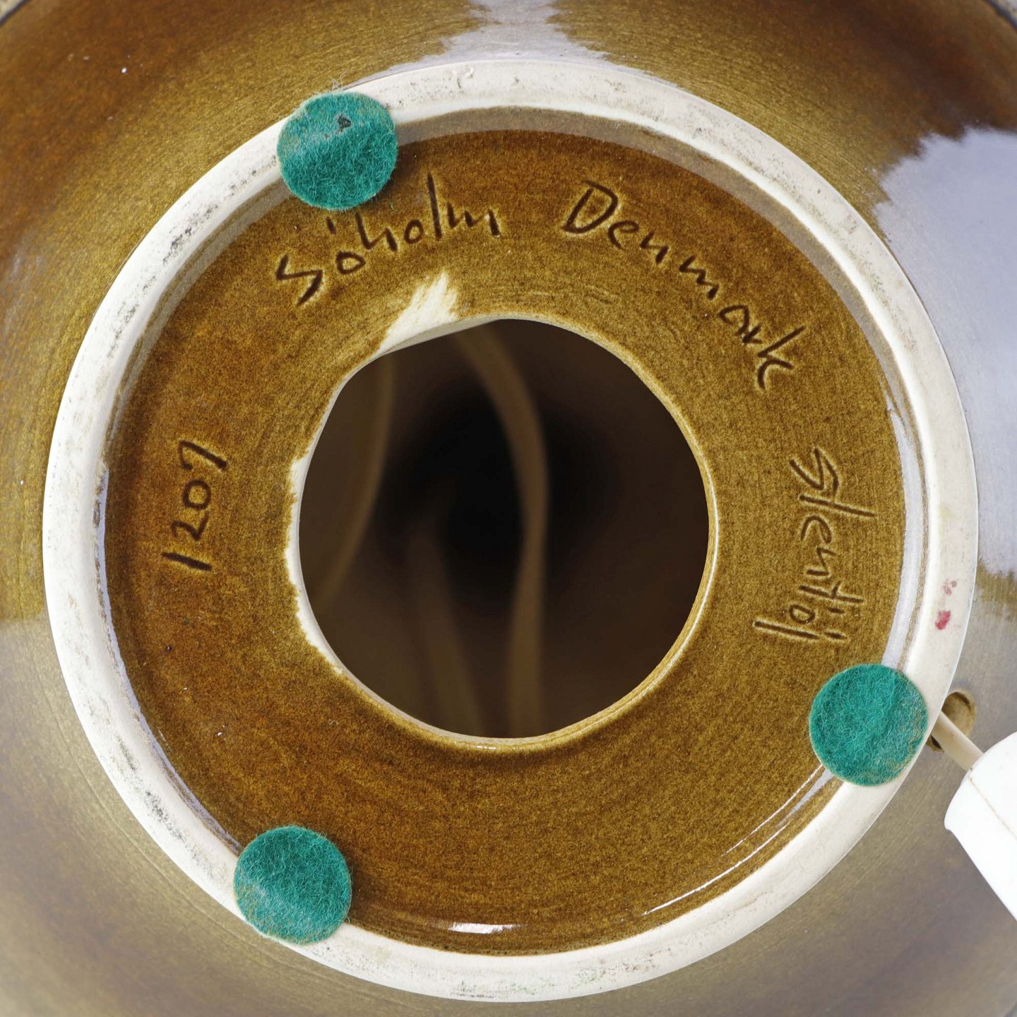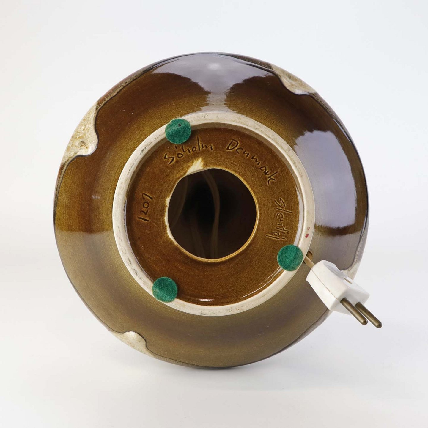 Lampefod i stentøj med harepelslignende glasur i brunlige nuancer. Ledningen ligger indeni foden. Nr. 1207