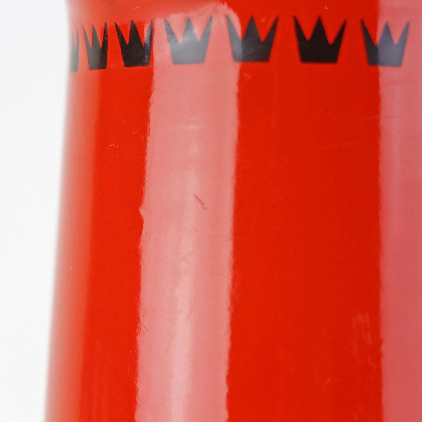 Dankok kande i metal belagt med rød, hvid og sort emalje og mønster af sorter tretakket kroner. Del af hanken er omgivet af sort plast.
