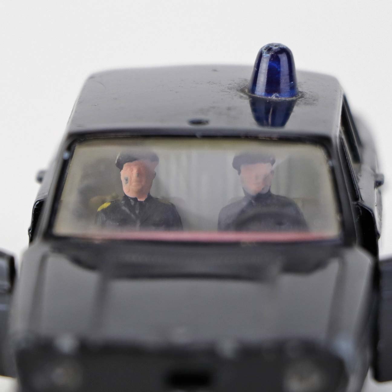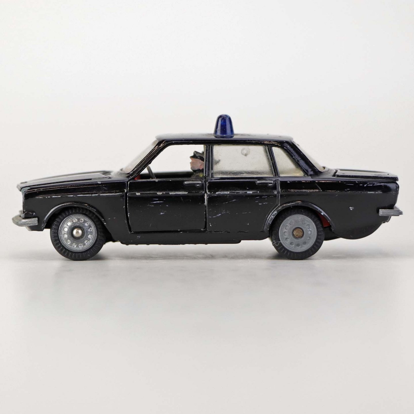 Politibil med to figurer. Legetøjsbil i sortlakeret metal med gummi hjul og blå blinklys. Model Volvo 144