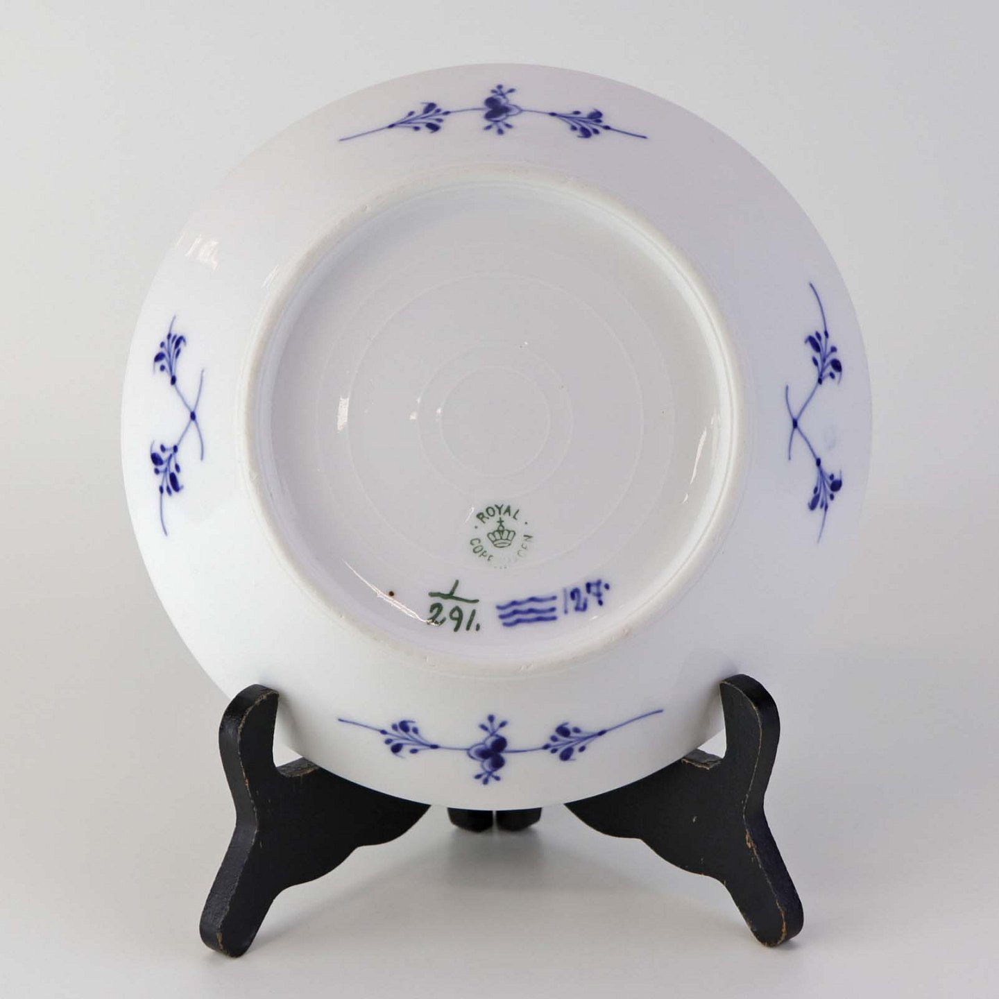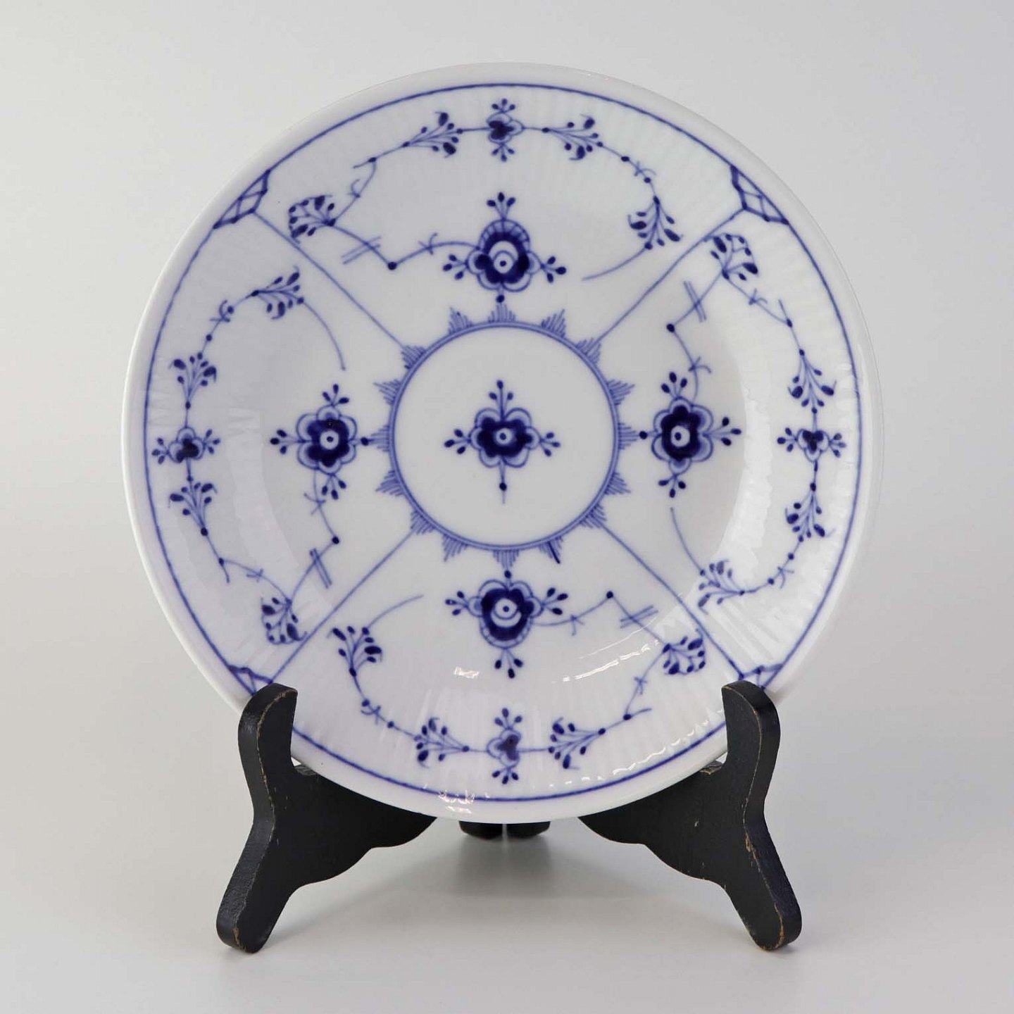 Musselmalet er af kongeligt hvidt porcelæn, dekoreret med rifler og mønster af blå ranker og blomster.