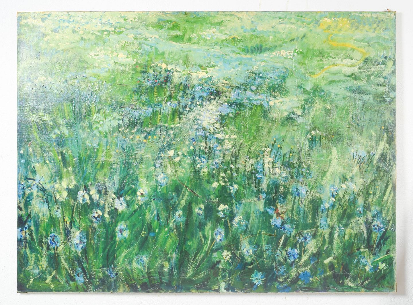 Ekspressivt landskab med blomstrende eng udført i en løs og farverig penselføring. Kompositionen fremstår med et let og atmosfærisk udtryk, hvor grønne og blå nuancer dominerer. Maleri af høj kvalitet. Signeret.
