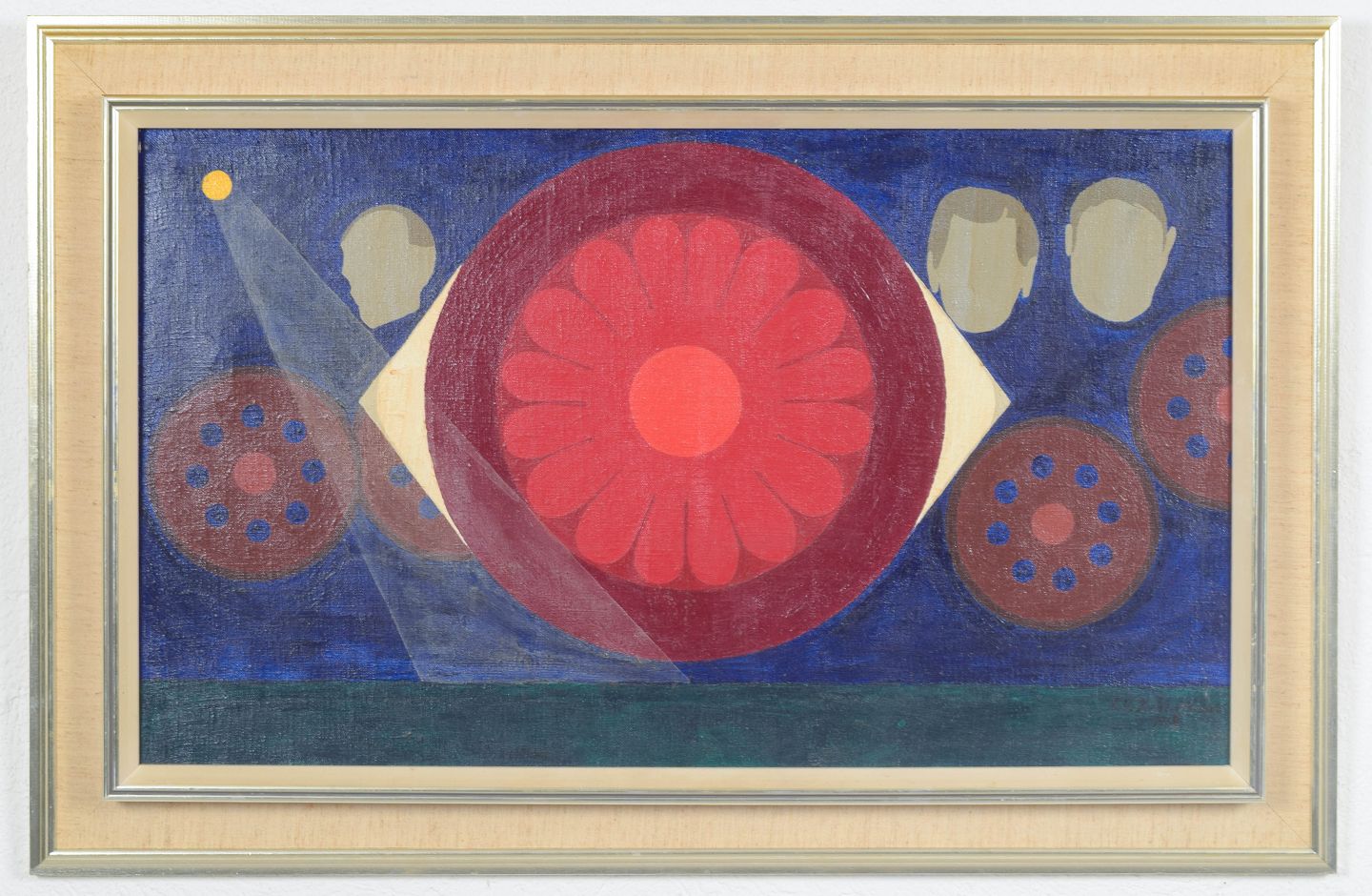 Surrealistisk komposition med stiliserede figurative og geometriske elementer i en afbalanceret og dekorativ opbygning, udført i klare farvefelter og med en drømmende, symbolsk karakter. Signeret og dateret 1969.