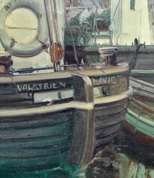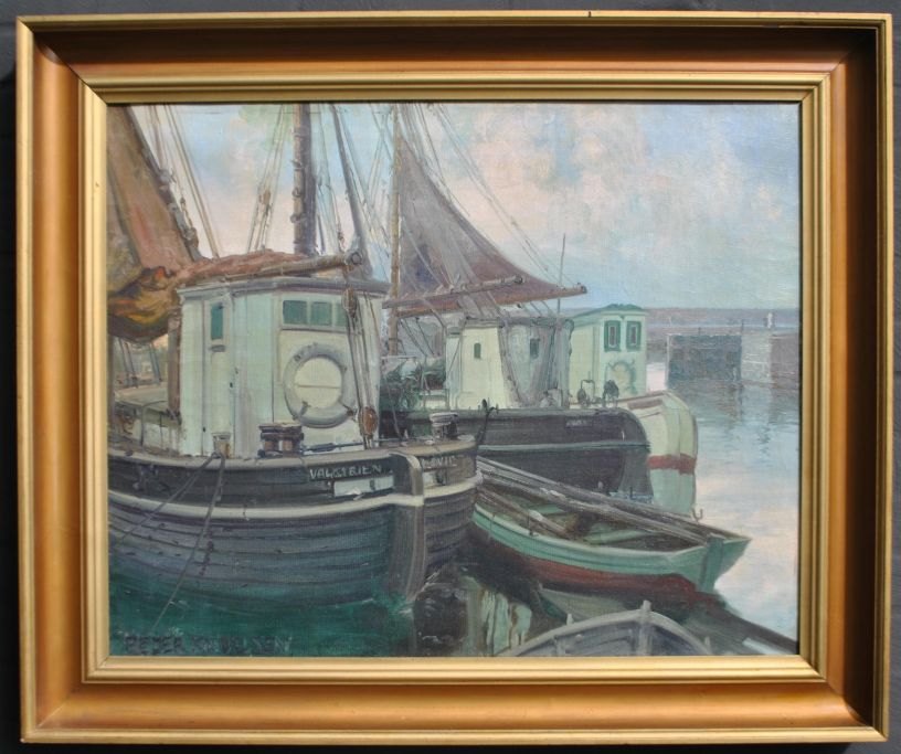 Knudsen, Peder Jacob Marius (1868–1944) Dänemark: Fischerboote in einem Hafen. Signiert. Öl auf Leinwand. 65 × 85 cm.
