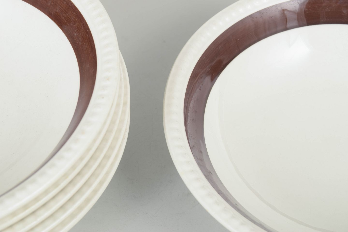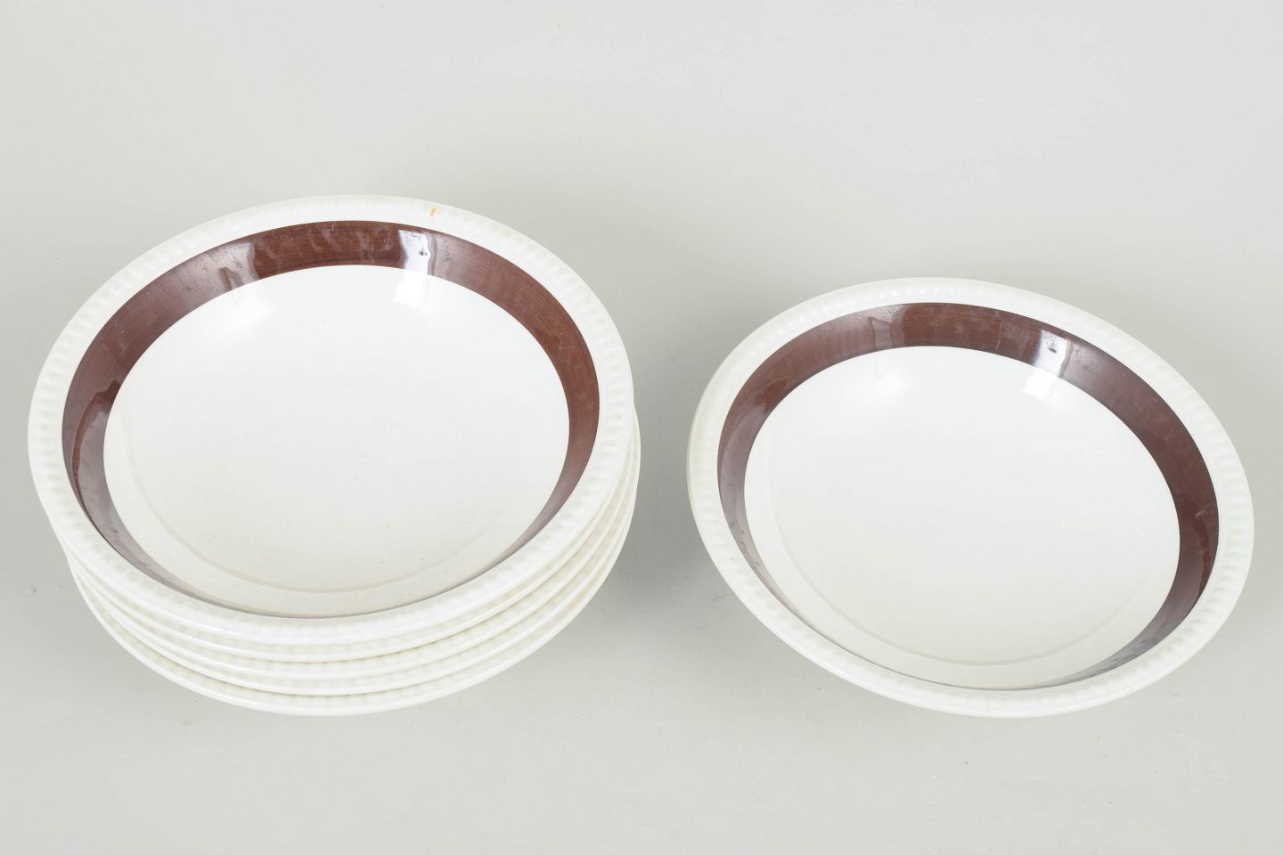 Klassisk retro stel i porcelæn med brun randdekoration på hvid bund, karakteristisk for skandinavisk bordservice fra midten af det 20. århundrede.
