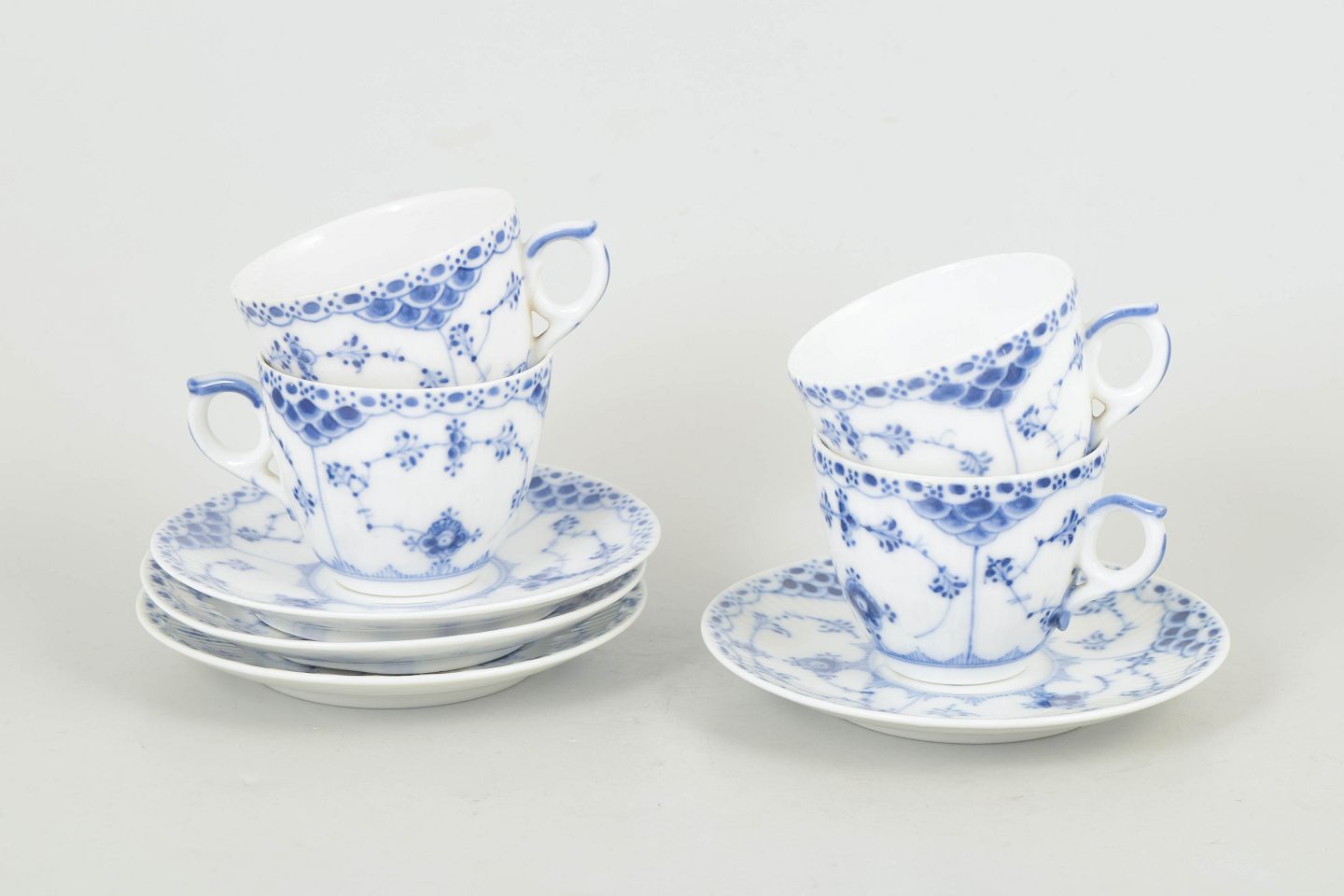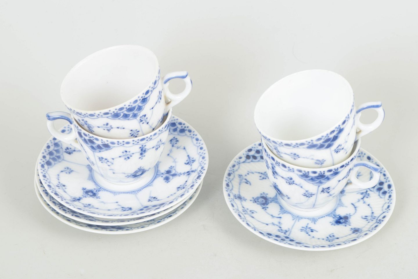Royal Copenhagen Musselmalet Halvblonde, sæt af fire kaffekopper med underkopper.