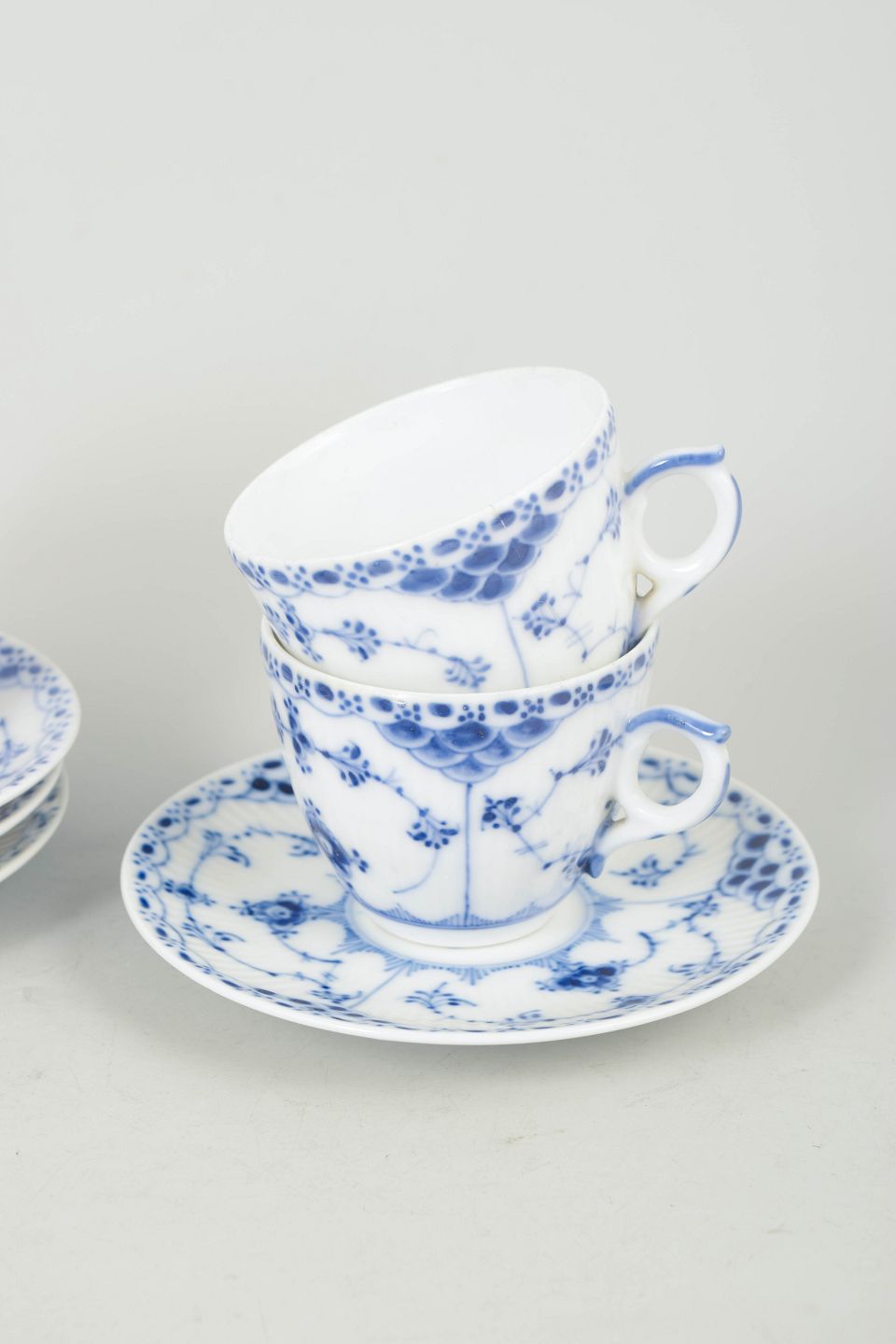 Håndmalede kaffekopper med underkopper i porcelæn med musselmalet halvblonde dekoration, model 1/528, dele med fabriksannullering markeret med én indridset streg.