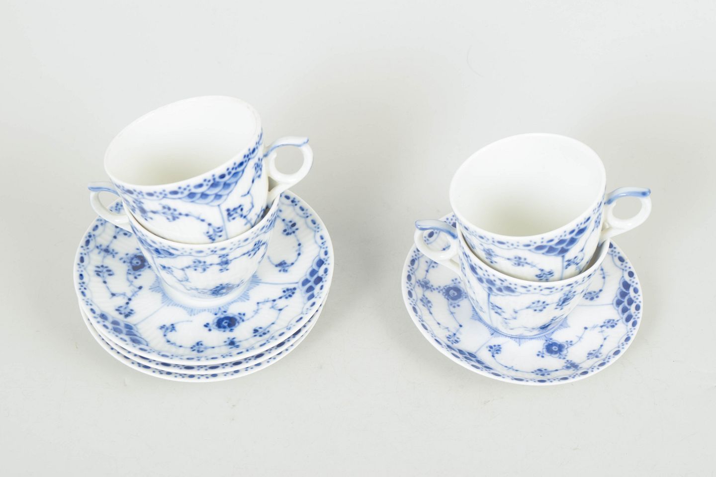 Royal Copenhagen Musselmalet Halvblonde, sæt af fire kaffekopper med underkopper.