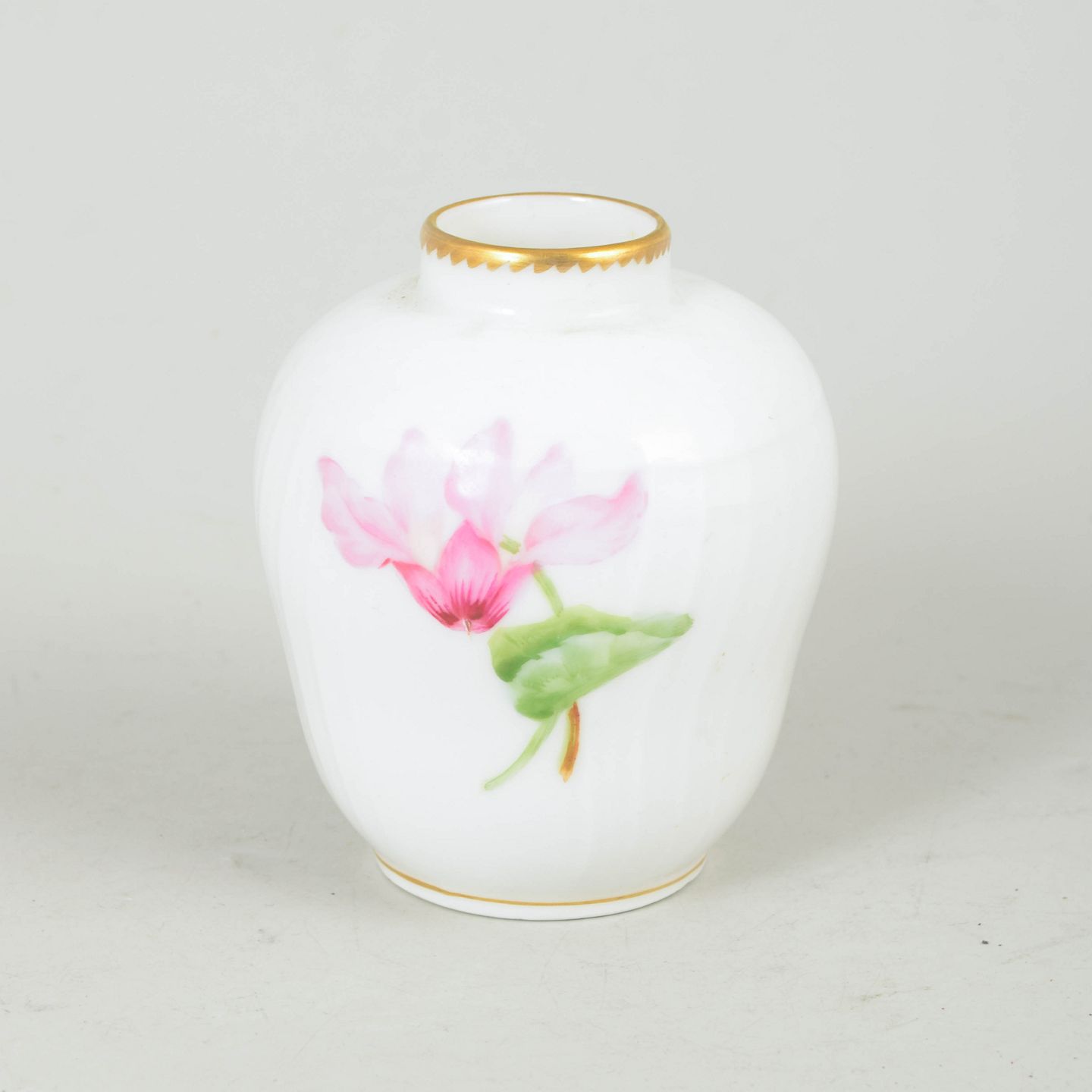 Håndmalet porcelænsvase med blomsterdekoration i Saksisk blomst på hvid glasur, afsluttet med forgyldt kant ved hals og fod. 1. sortering.