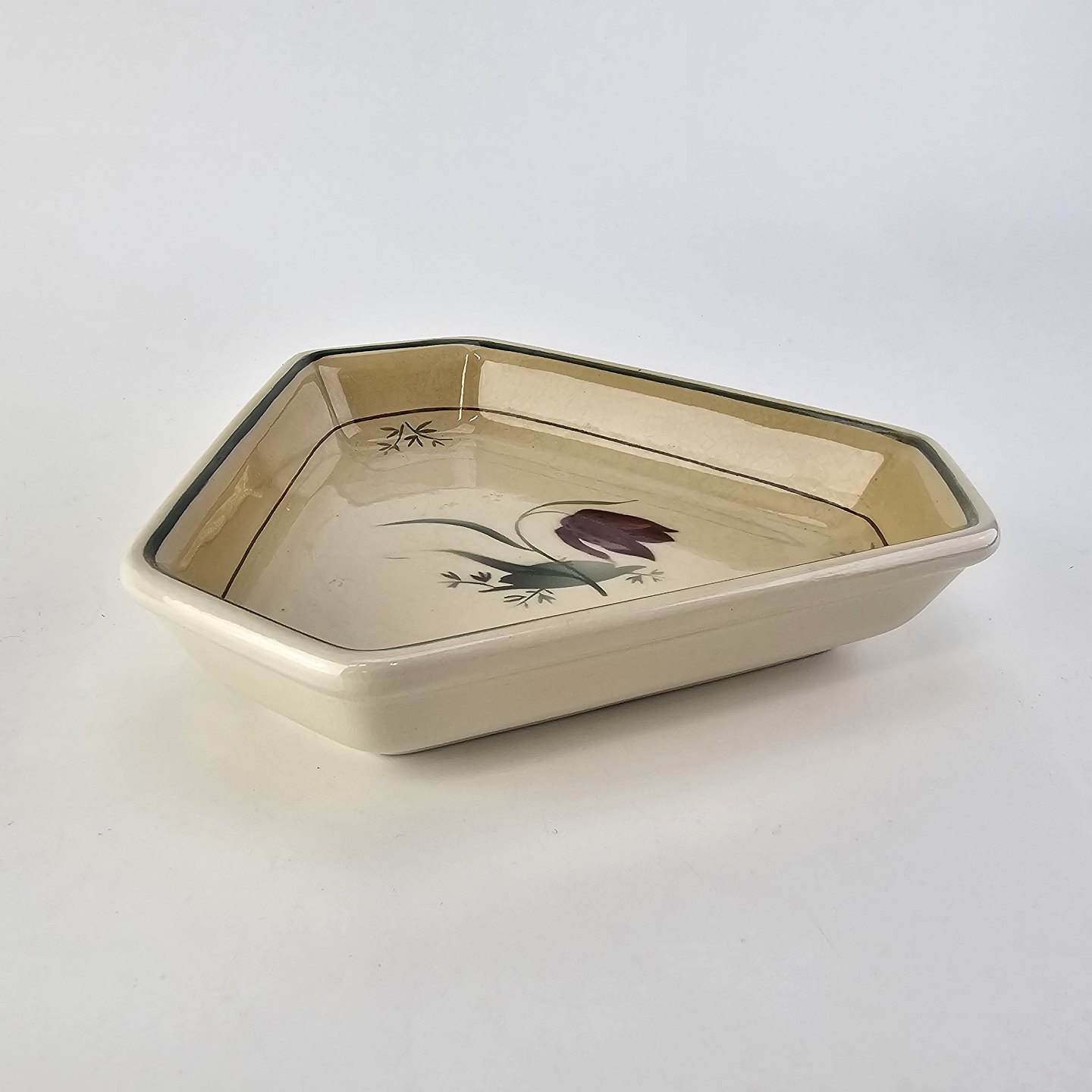 Fajancestel i stelform Viktoria II (Fletværk) med flettet kant og dekoration af en vibeæg blomst i violet og grøn, fremstillet i perioden 1934-1967