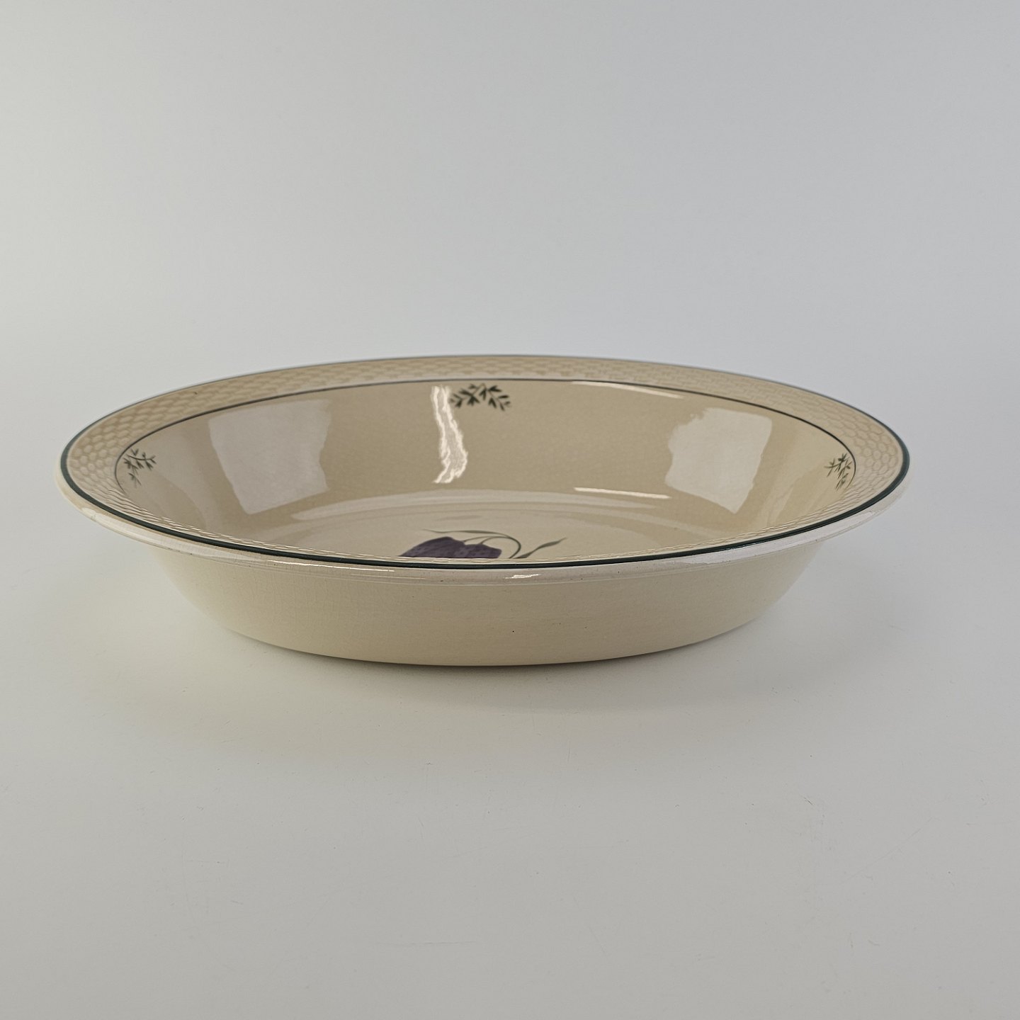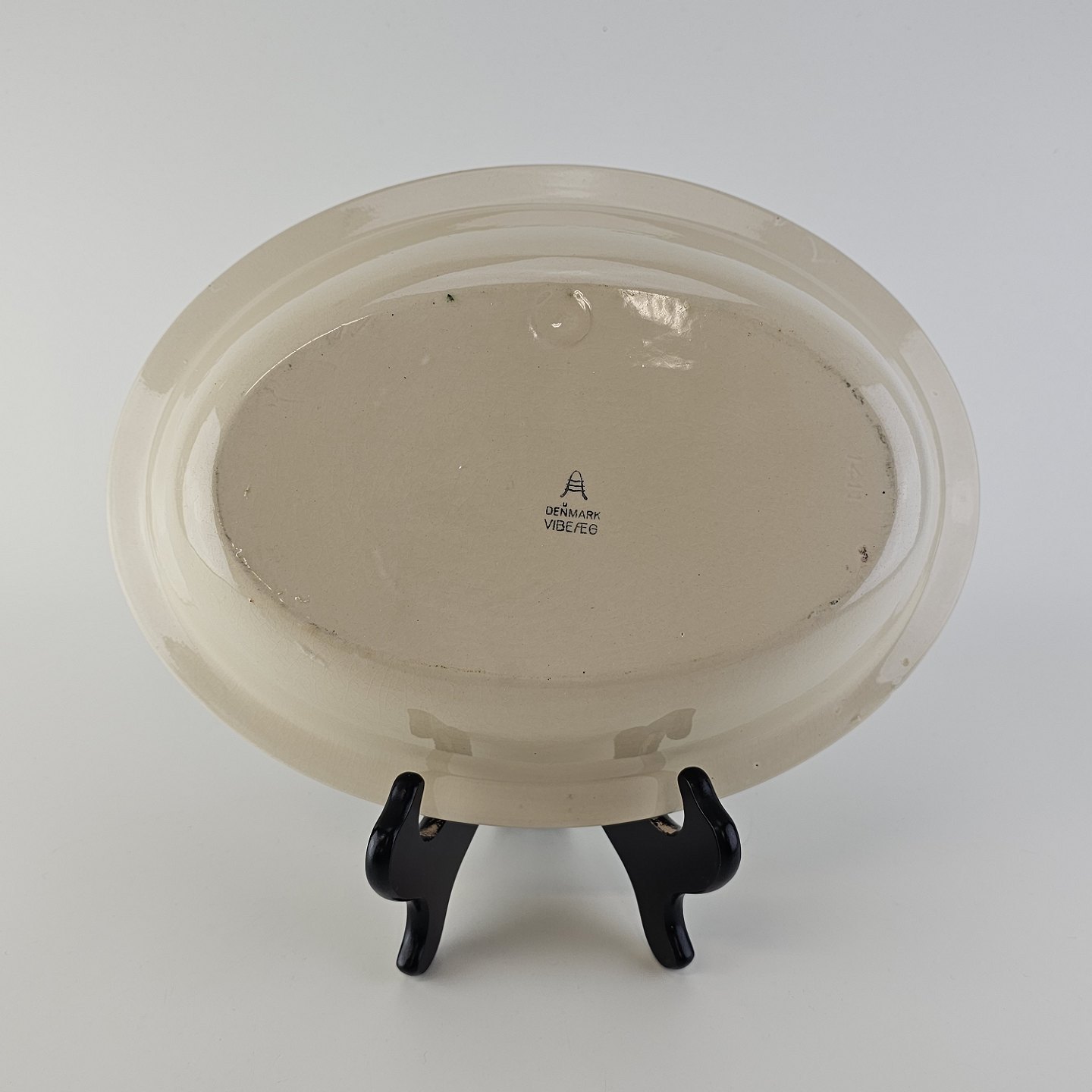 Fajancestel i stelform Viktoria II (Fletværk) med flettet kant og dekoration af en vibeæg blomst i violet og grøn, fremstillet i perioden 1934-1967