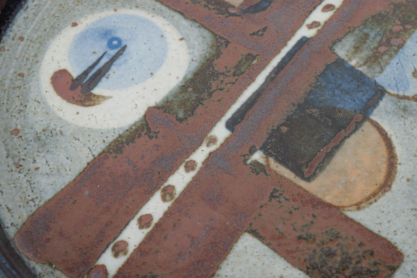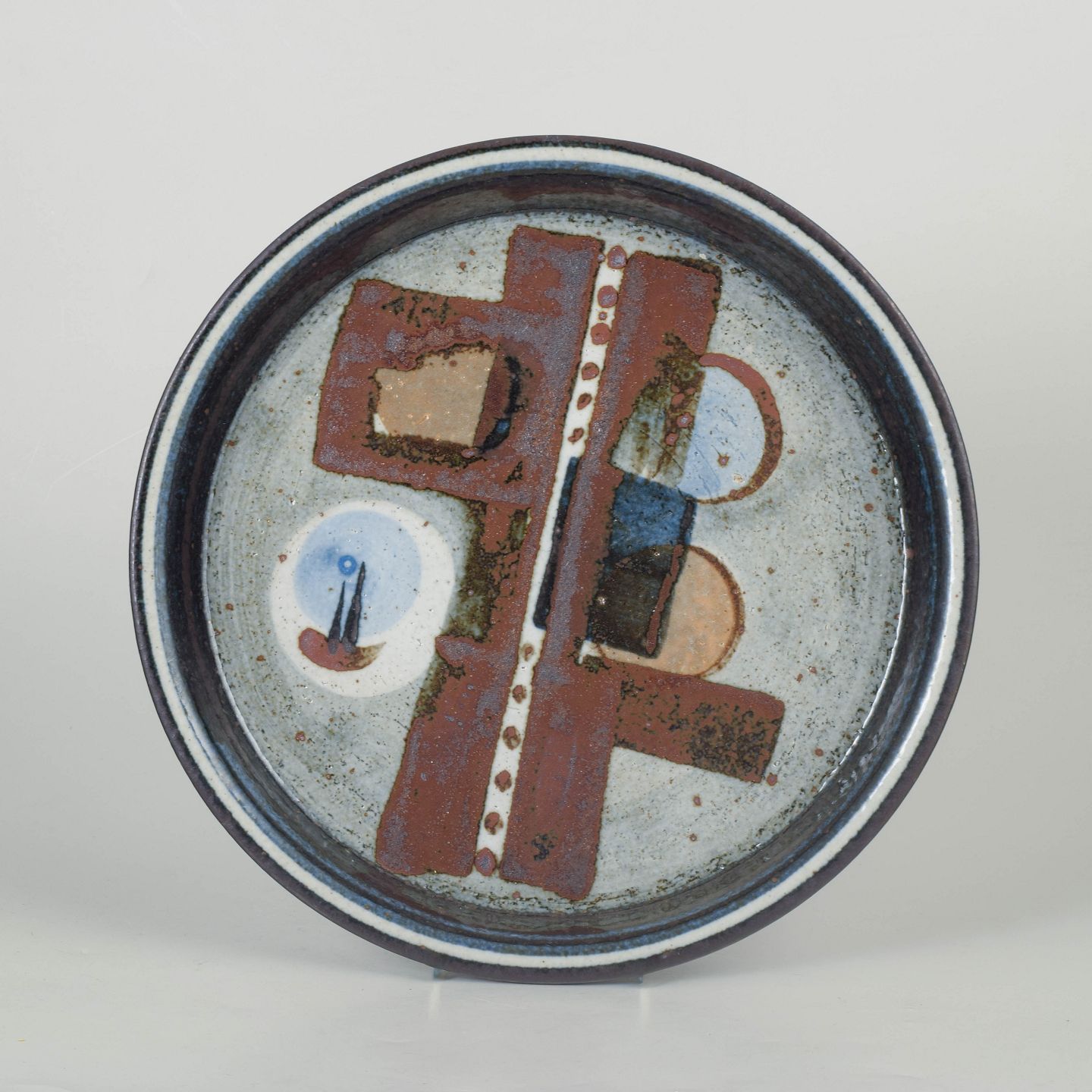 Stort rundt fad i stentøj med kunstnerisk dekoration i geometriske former og jordfarvede nuancer. Model Drejar-gruppen, fremstillet 1976.