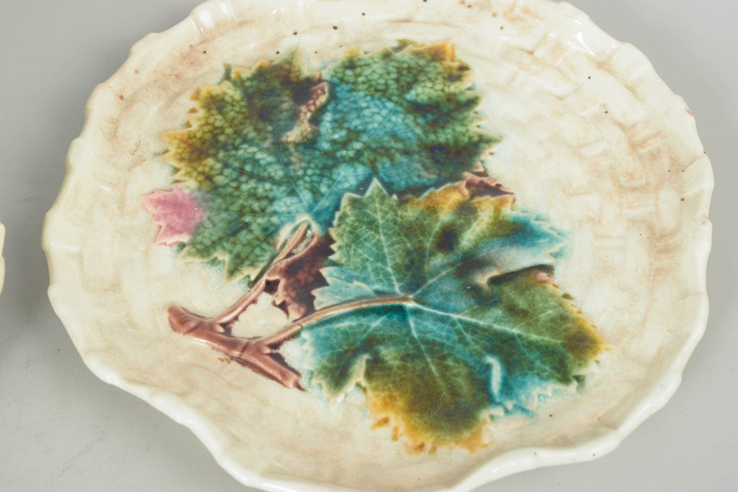 Dekorative tallerkener i glaseret fajance med reliefpræget og naturalistisk blomsterdekoration i farverig majolika glasur. Stemplet.