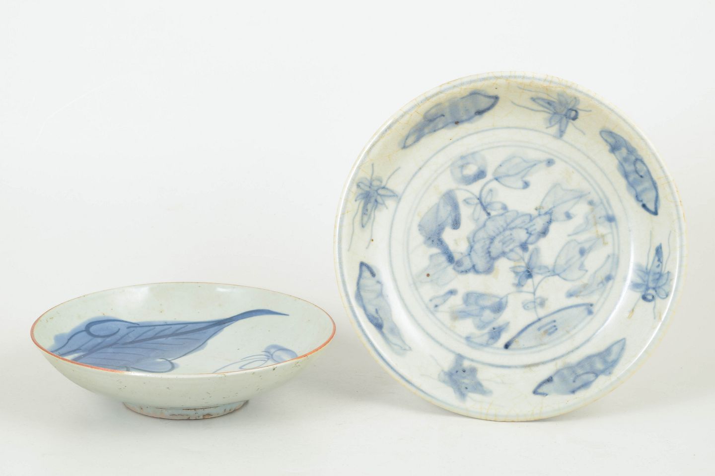 To hånddrejede porcelænsskåle med håndmalet blå dekoration under glasur, med klassiske motiver fra perioden.